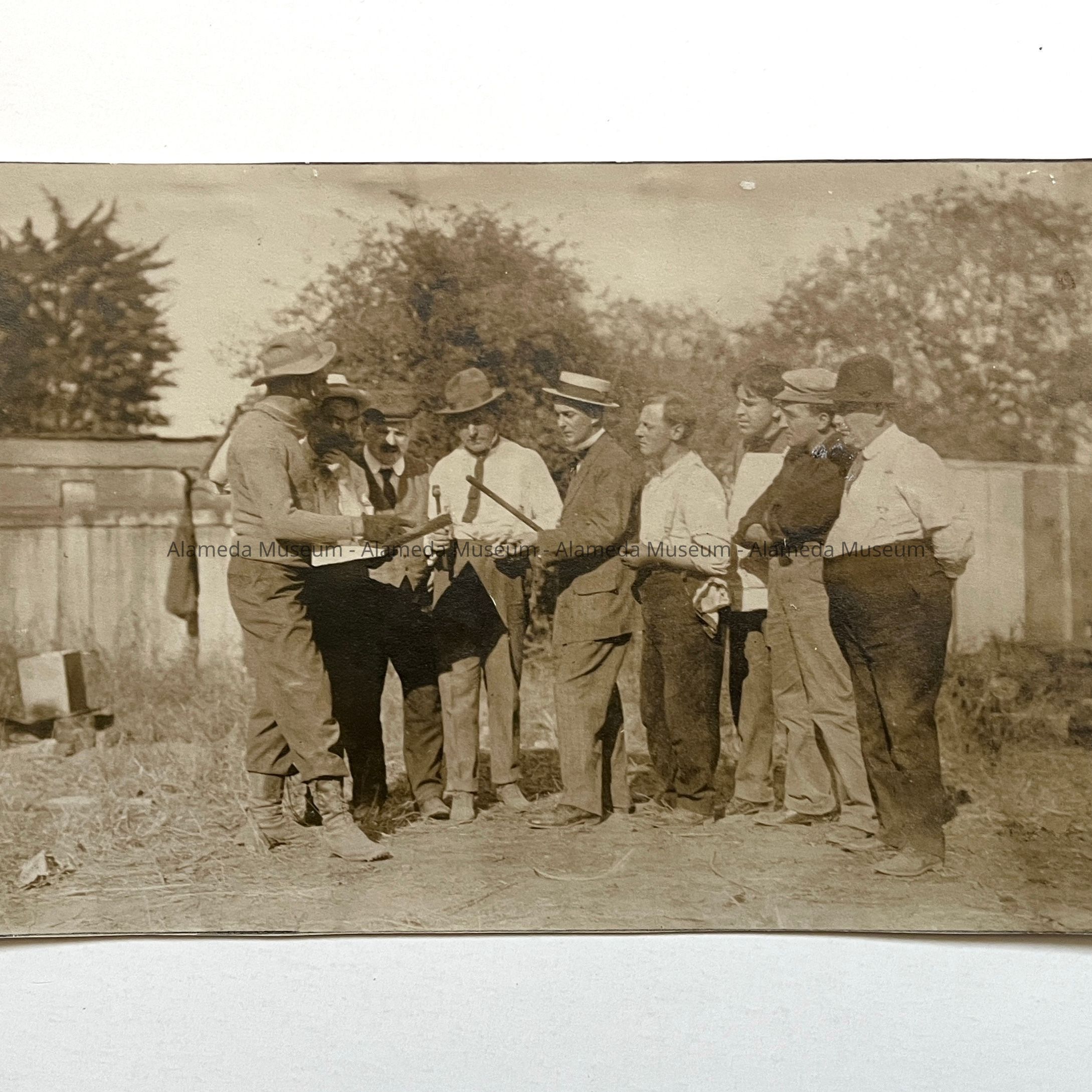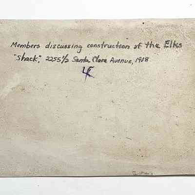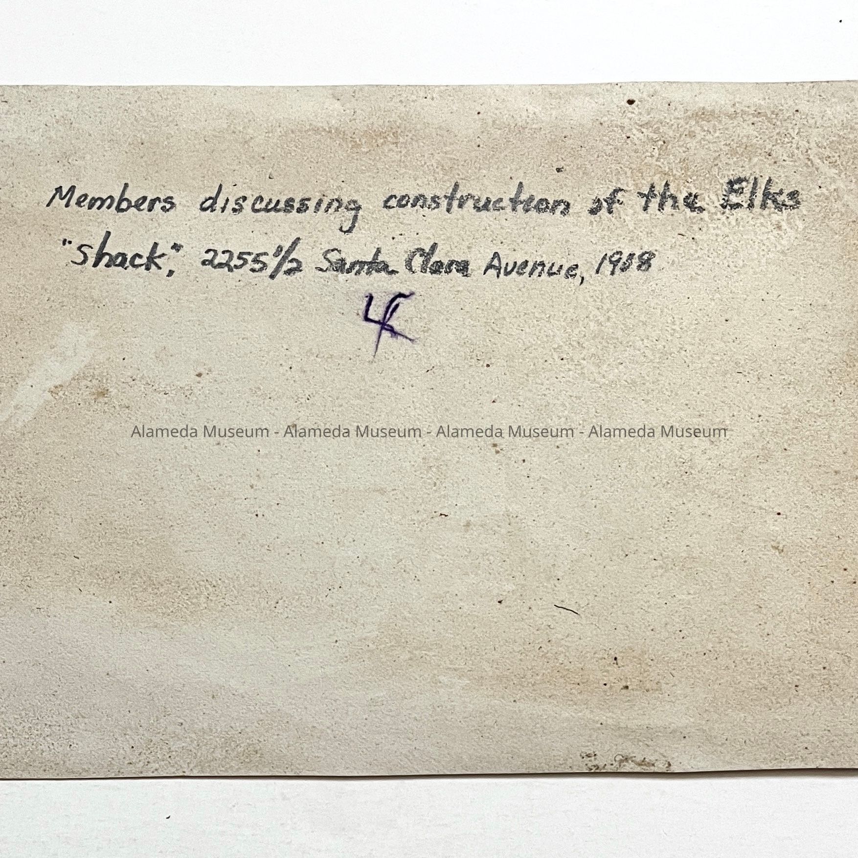 PHOTOGRAPH OF UNIDENTIFIED MEMBERS OF THE ALAMEDA ELKS LODGE DISCUSSING CONSTRUCTION OF THE ELKS'S "SHACK, " 22551 SANTA CLARA AVENUE, ALAMEDA WHICH WAS DESIGNED AND COMPLETED IN ONE DAY BY MEMBERS OF THE LODGE IN 1908. PHOTO WAS DONATED TO THE ALAMEDA HISTORICAL SOCIETY PRIOR TO 1971 AND HERETOFORE NOT OFFICIALLY CATALOGED.