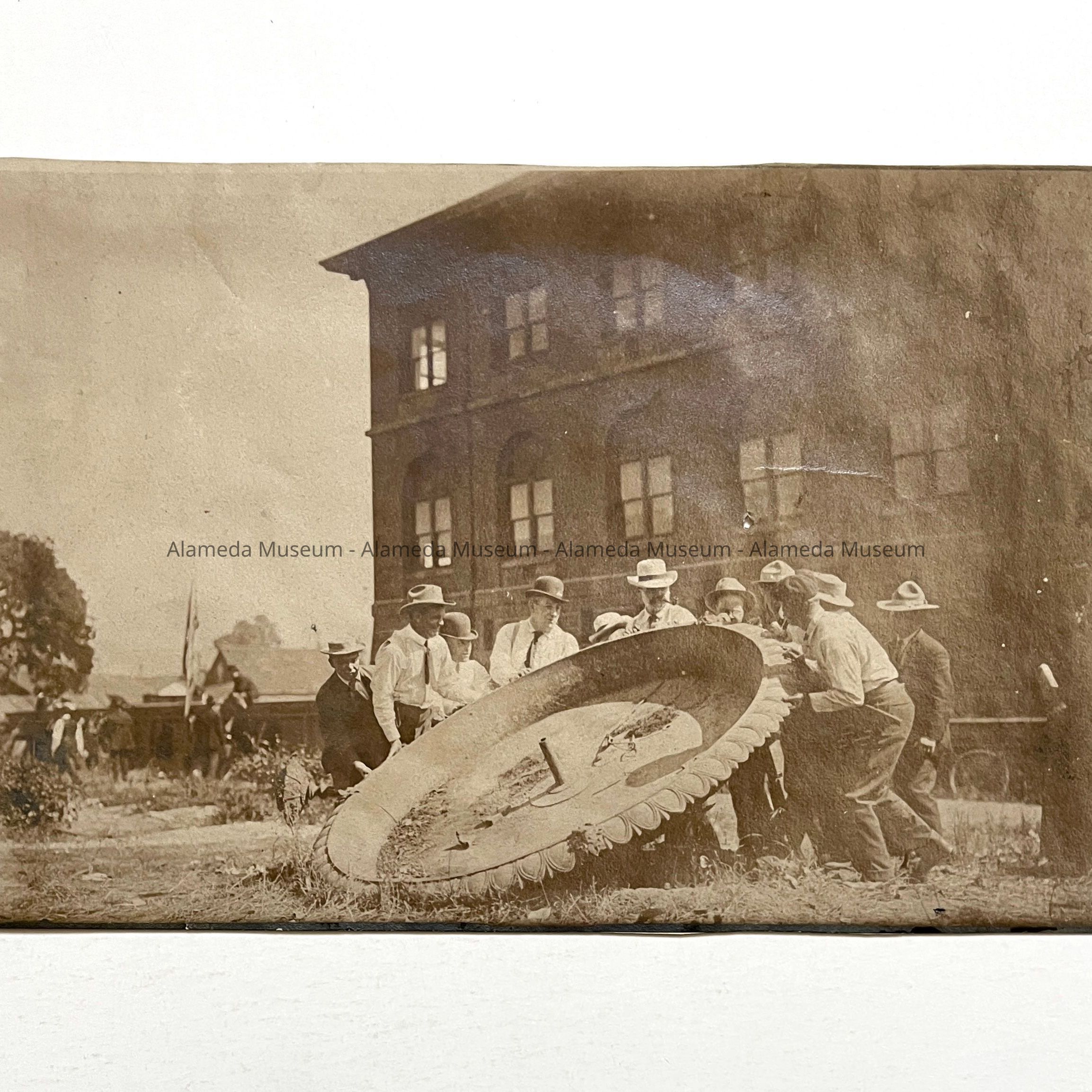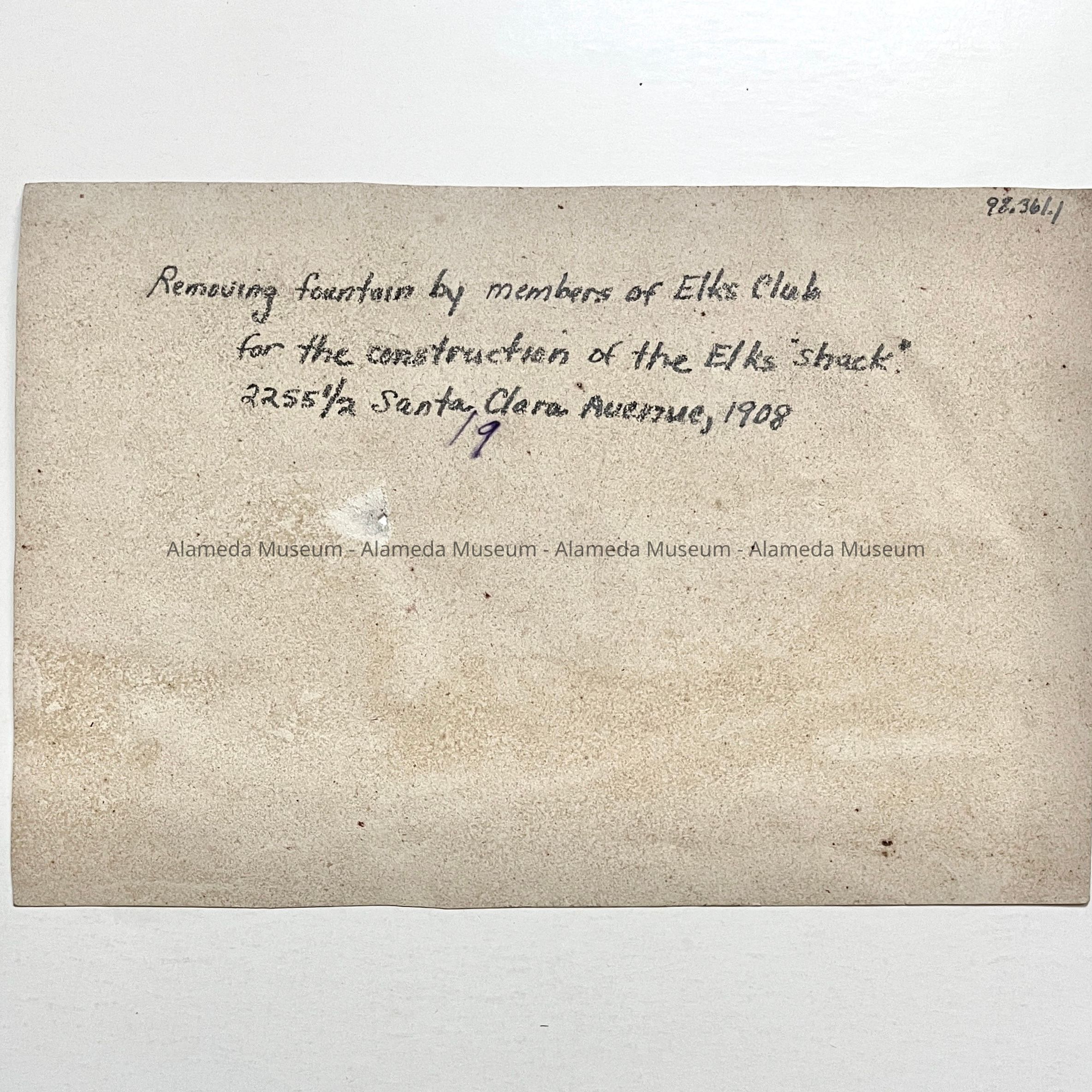 PHOTOGRAPH OF VOLUNTEER MEMBERS OF THE FRATERNAL LODGE OF THE ELKS --- REMOVING AN ORNAMENTAL FOUNTAIN WHICH APPEARS TO BE OF CAST IRON. FOUNTAIN WAS REMOVED TO MAKE WAY FOR CONSTRUCTION OF THE ELKS "SHACK," AT 22551 SANTA CLARA AVE. IT WAS DESIGNED AND COMPLETED IN ONE DAY BY MEMBERS OF THE ALAMEDA ELKS LODGE. THE "SHACK" SERVED AS THE ORGANIZATION'S MEETING PLACE UNTIL THE MAIN LODGE HEADQUARTERS WERE BUILT IN 1909 @ 2255 SANTA CLARA AVENUE, ALAMEDA. PHOTO WAS DONATED TO THE ALAMEDA HISTORICAL SOCIETY PRIOR TO 1971 AND HERETOFORE NOT OFFICIALLY DOCUMENTED.