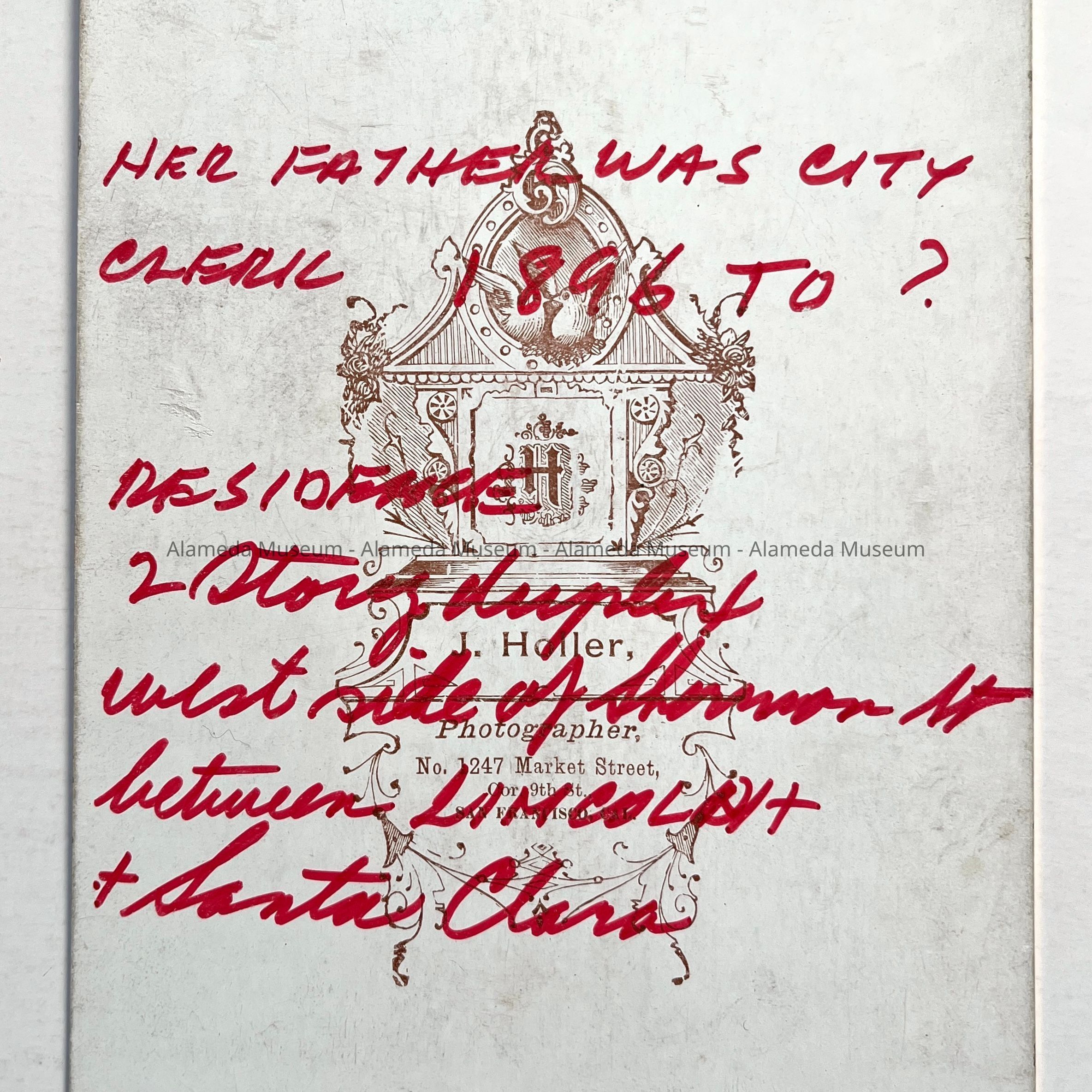 HISTORY OF OBJECT: PHOTO OF ELLA BROWNING, HER FATHER WAS CITY CLERK, 1896 TO ? , RESIDENCE 2 STORY DUPLEX, WEST SIDE OF SHERMAN ST, BETWEEN LINCOLN AND SANTA CLARA.