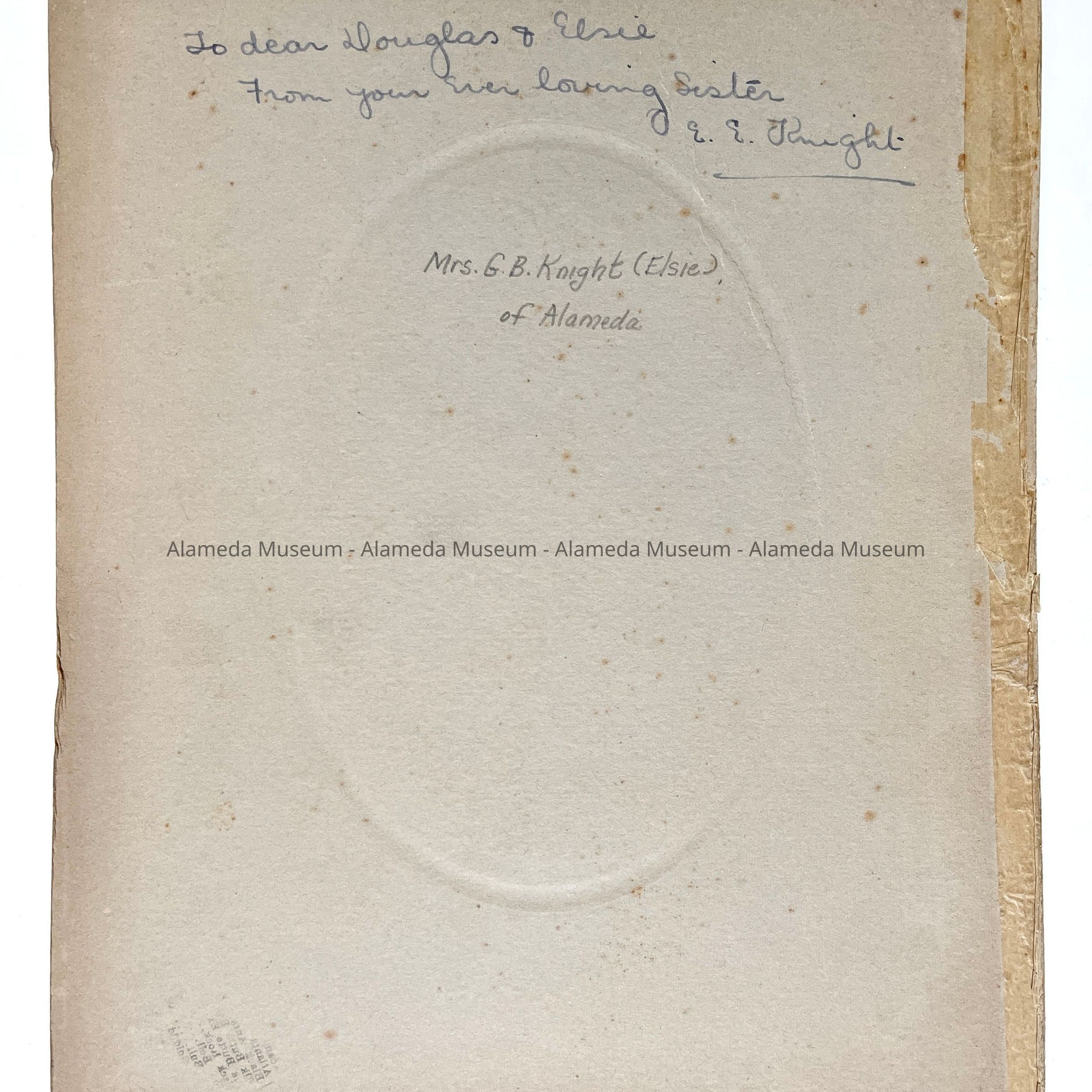 OVAL-SHAPED BLACK-AND-WHITE PHOTOGRAPH ON OFF-WHITE-COLORED MOUNTING. MOUNTING IS SIGNED, "HE HUNT, CROCKETT, CALIFORNIA." PORTRAIT OF ELSIE (MRS G B) KNIGHT, LONG-TIME ALAMEDA RESIDENT. ELSIE WAS MOTHER OF EILEEN.