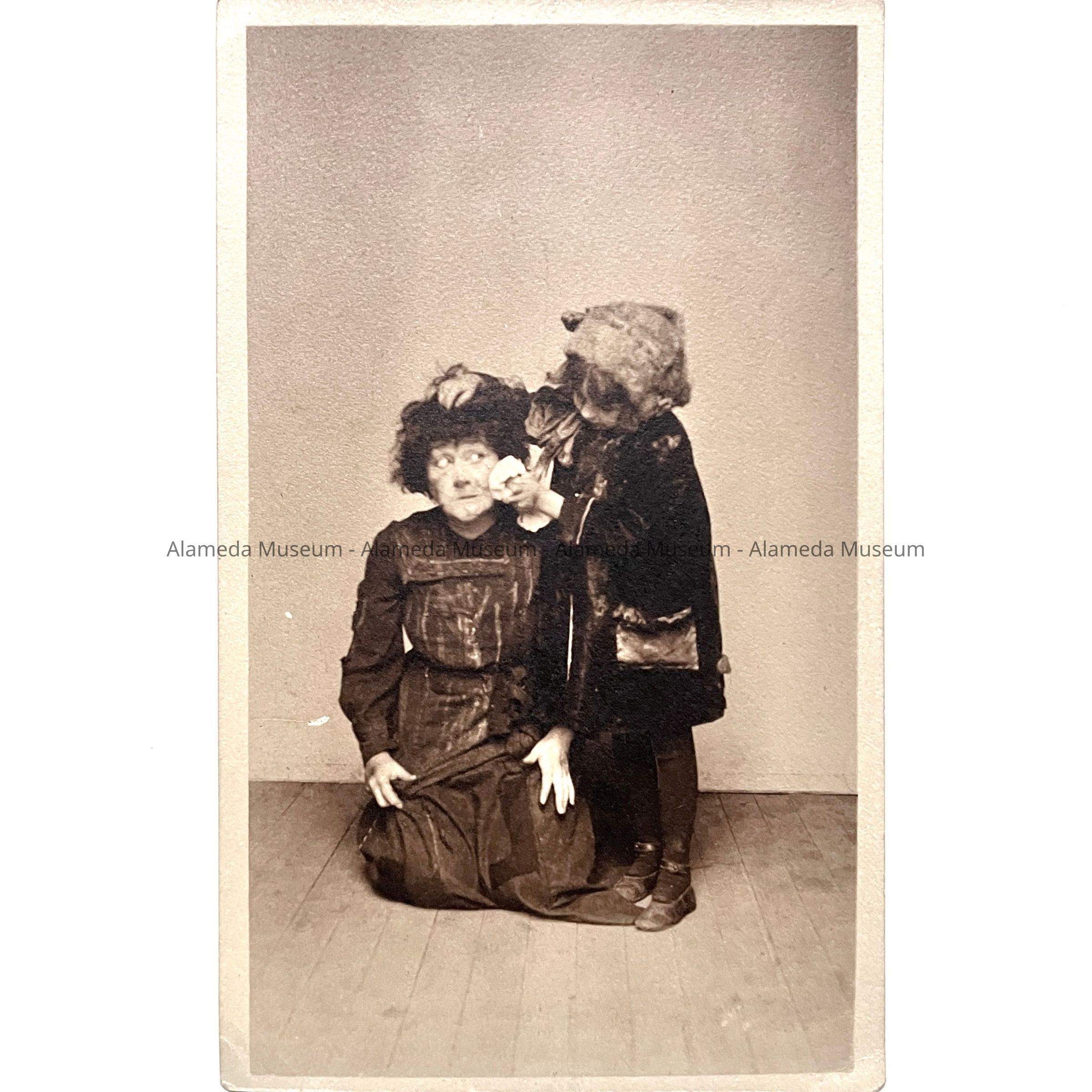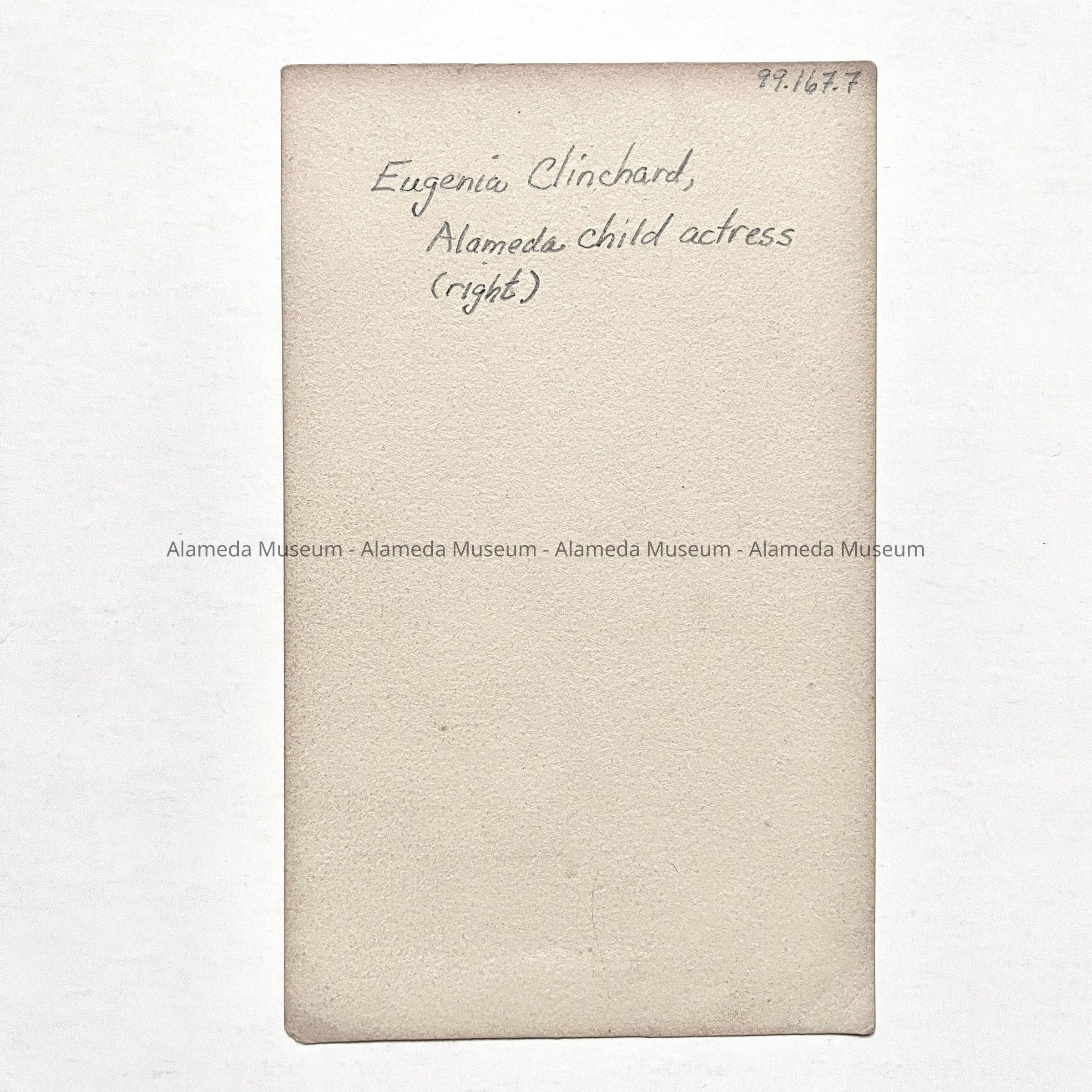 History: Photograph of child actress Eugenia Clinchard posed with an unknown woman.The pose appears to be a segment from a theatrical production.