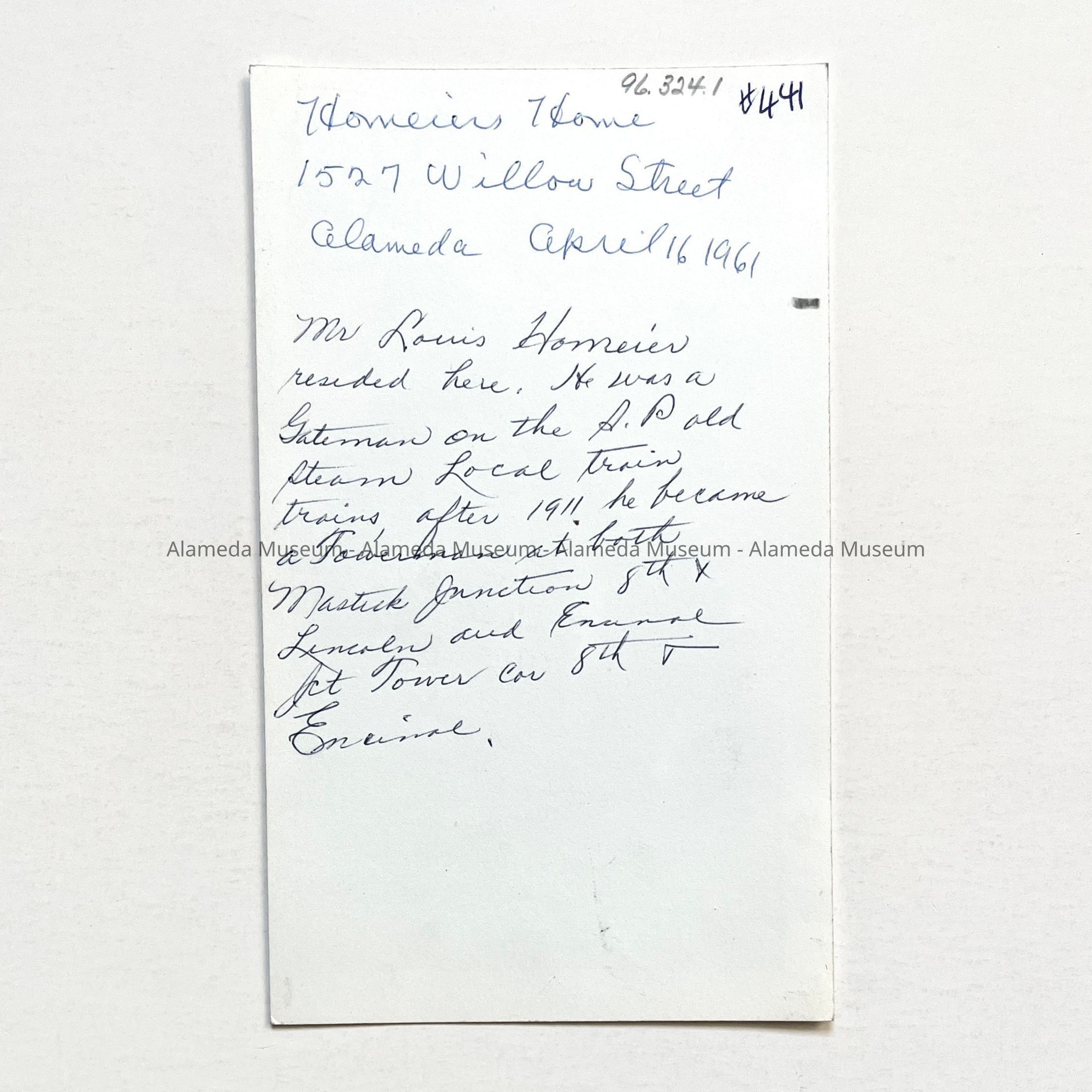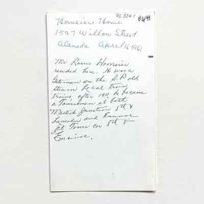 History of Object: View of a one-story Victorian cottage once occupied by Louis Homeier who, according to the 1912 Alameda City Directory, was a musician by Occupation. However, information written on the verso mentions Mr. Homeier's employment by the southern Pacific Railroad in Alameda as a gateman and, later, a towerman. The home was erected in 1880 and is located at 1527 Willow St.