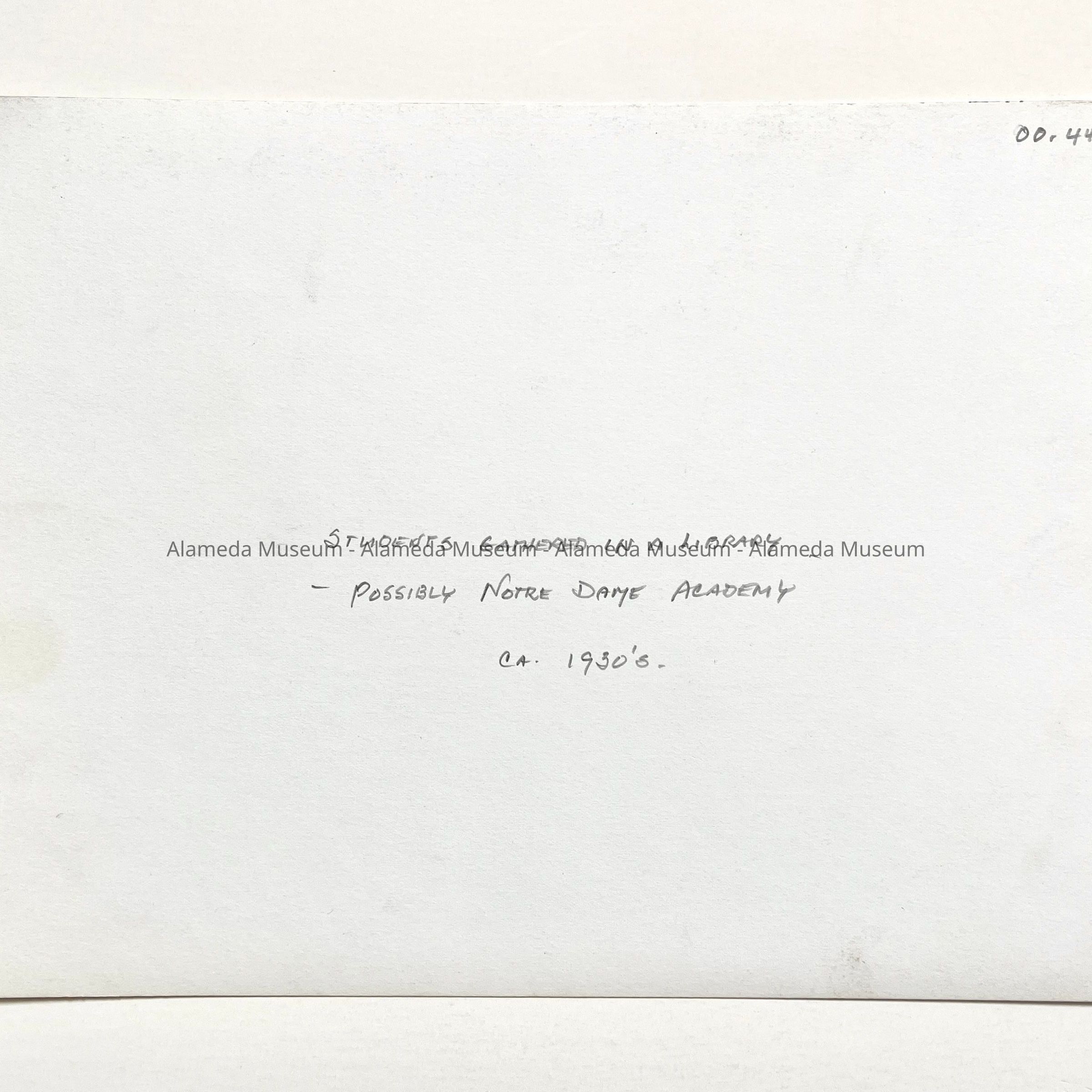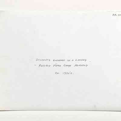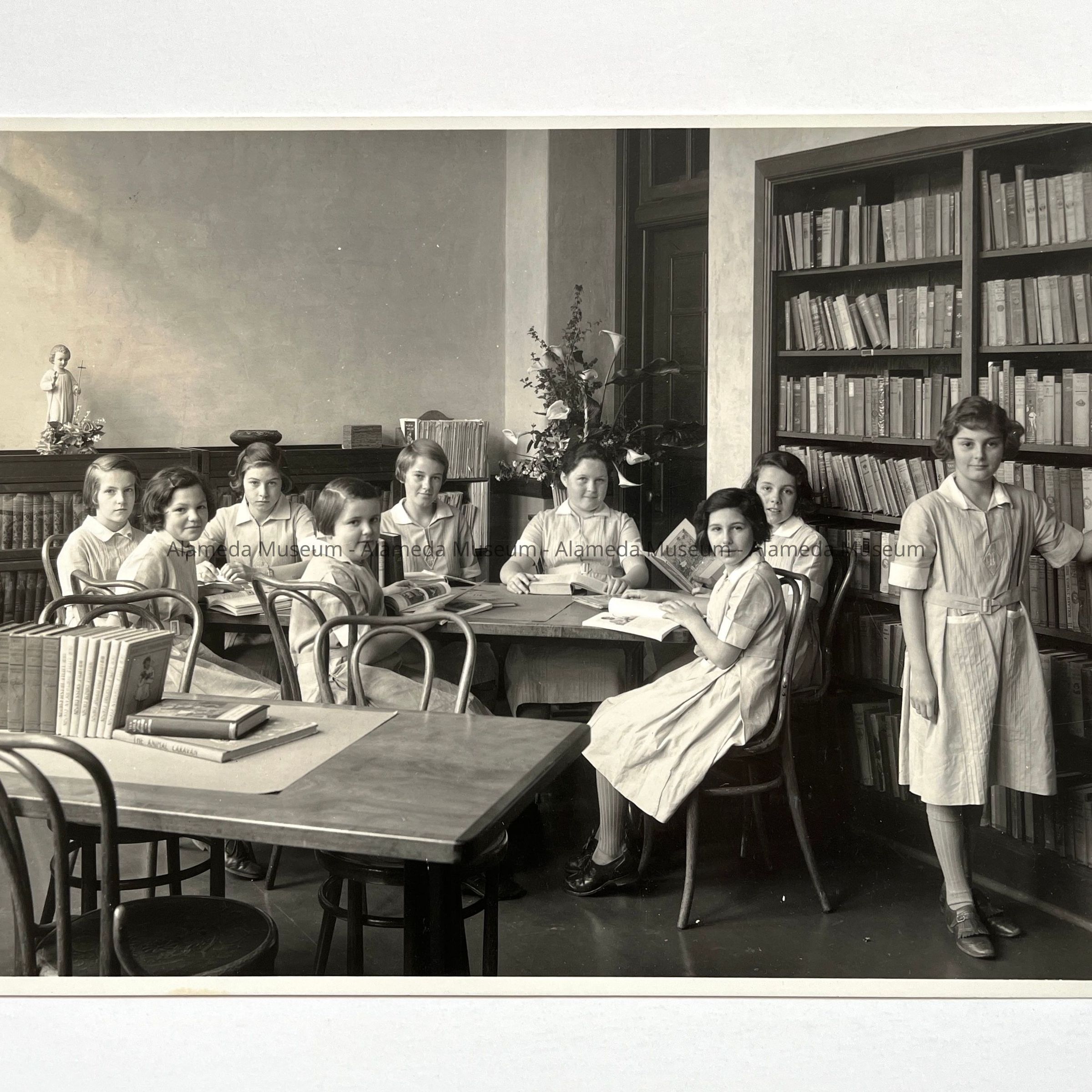 History of Object: Students gathered in a library in what is possibly Notre Dame Academy in Alameda (because of the religious statue in evidence and the fact that the students are female and in uniforms).