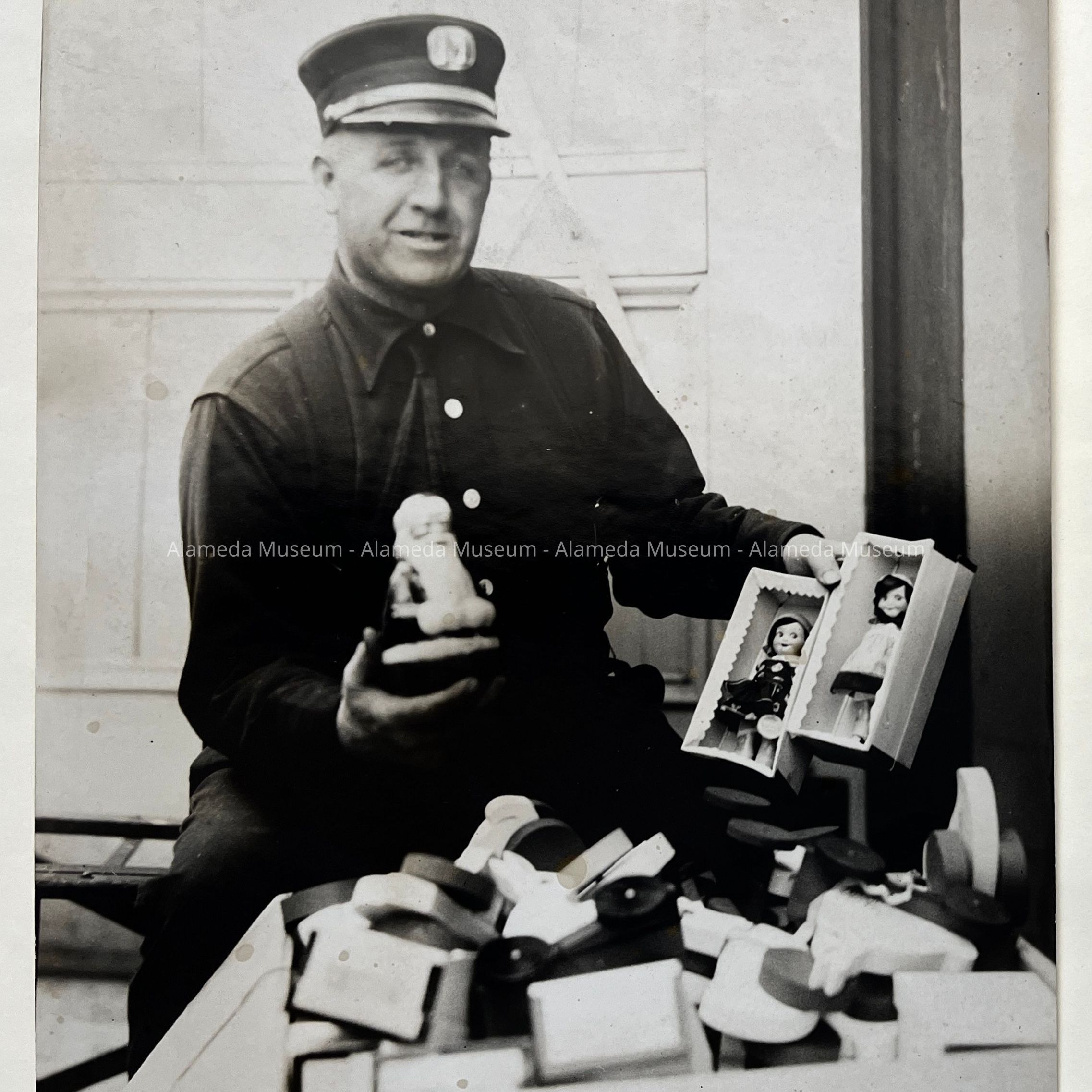 Photo of Fire Captain Gus Wagner among toys to be distributed, c. 1930Entry/Object ID