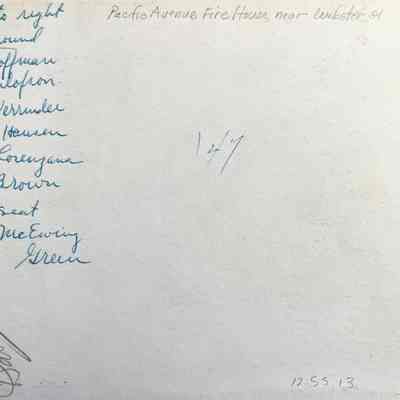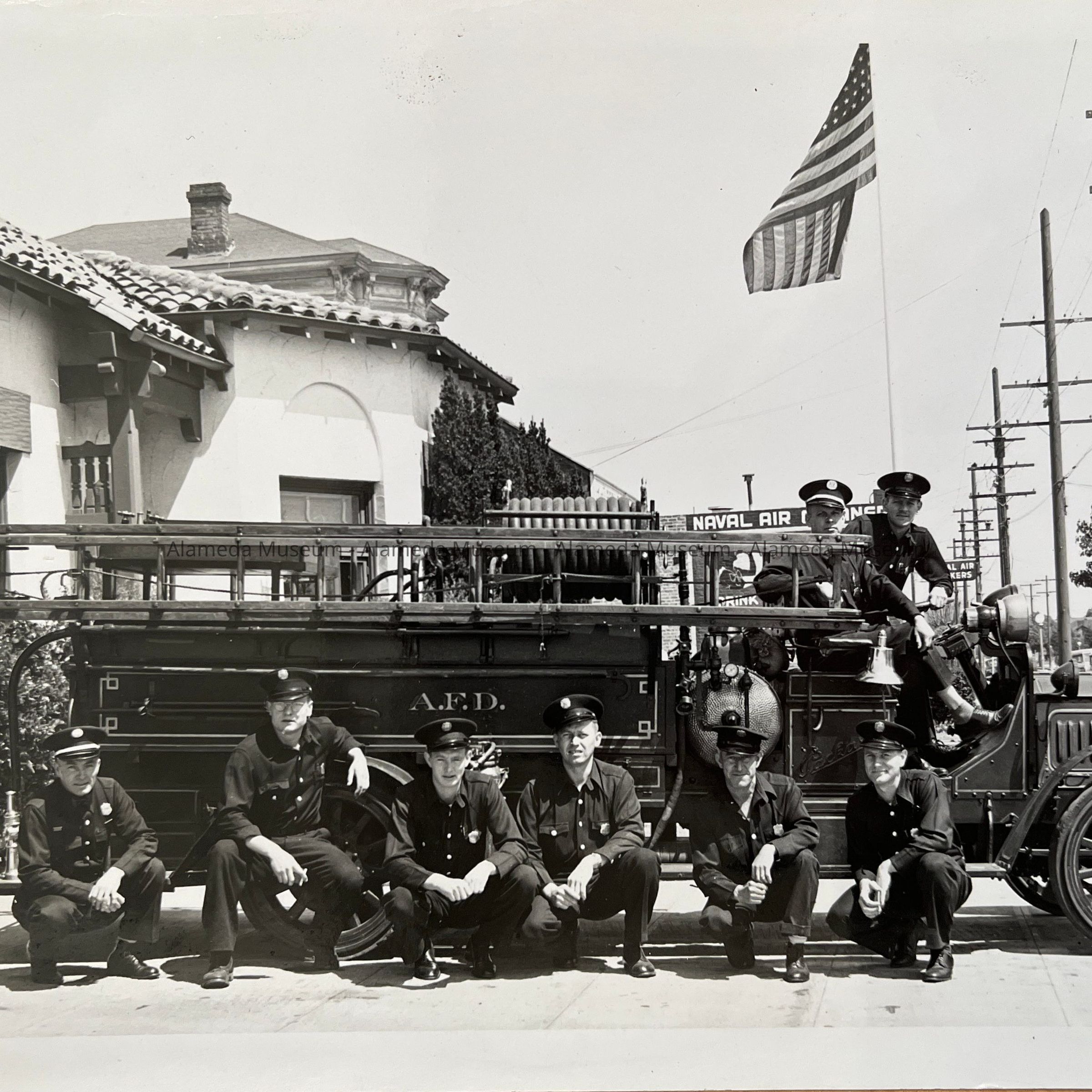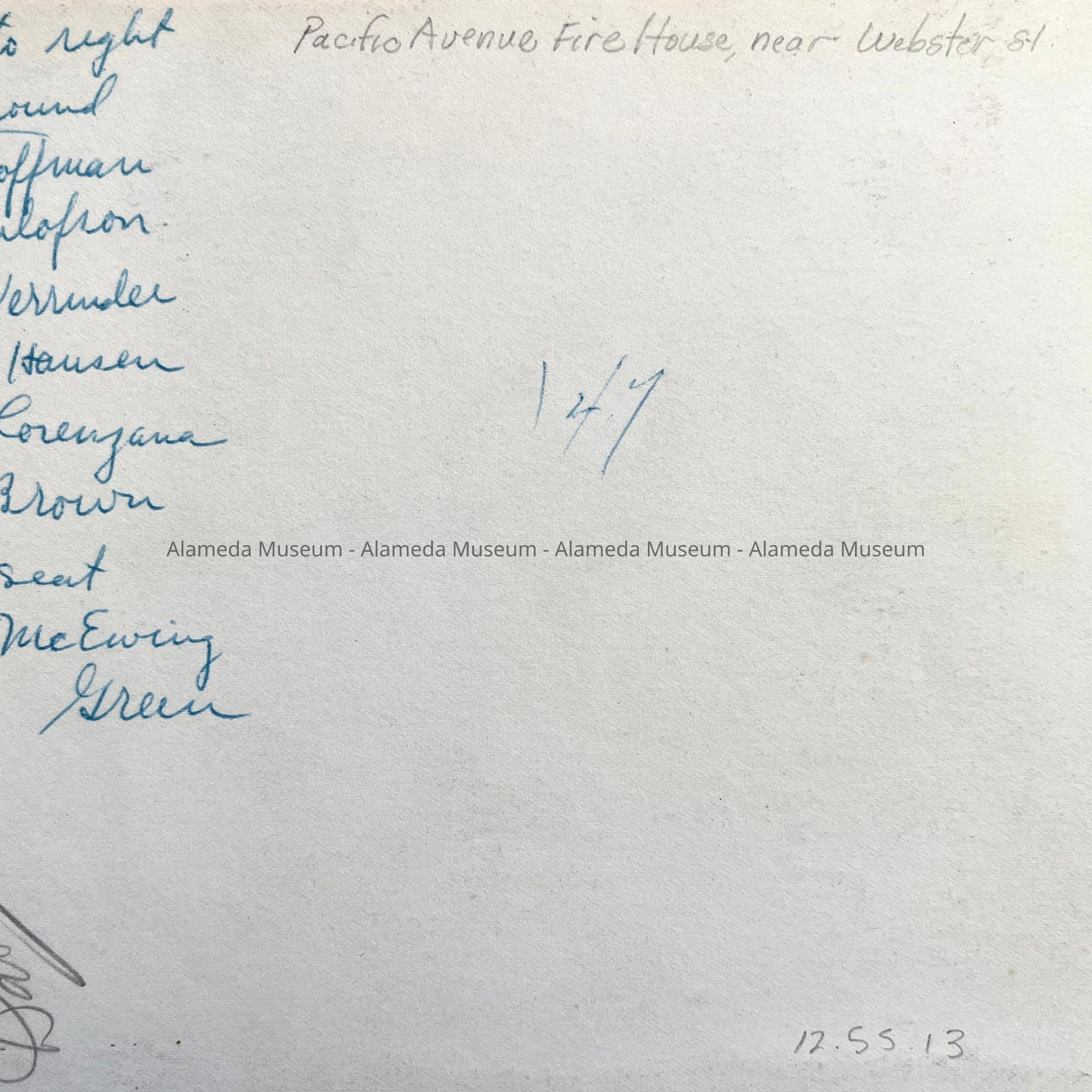 History of Object: Photo of hook and ladder truck parked in the driveway of Pacific Ave. Alameda Fire Dept. Firehouse near Webster St. Photo includes a list of personnel posed in front of the fire engine.