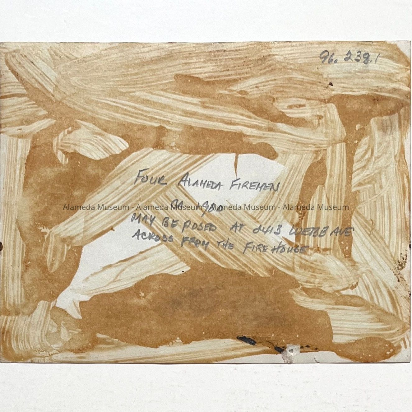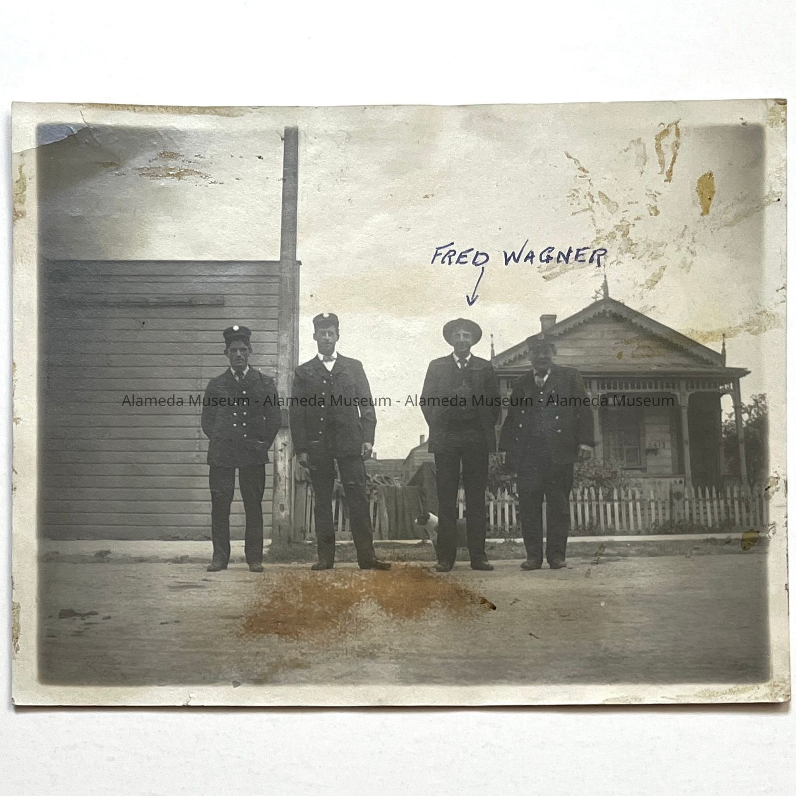 History of Object: Four firemen standing in the street in front of an old house with a picket fence and a dog nearby. House is probably 2143 Webb Avenue, which would be directly across from Fire Station #1. Fred Wagner, one of the firemen, is identified.