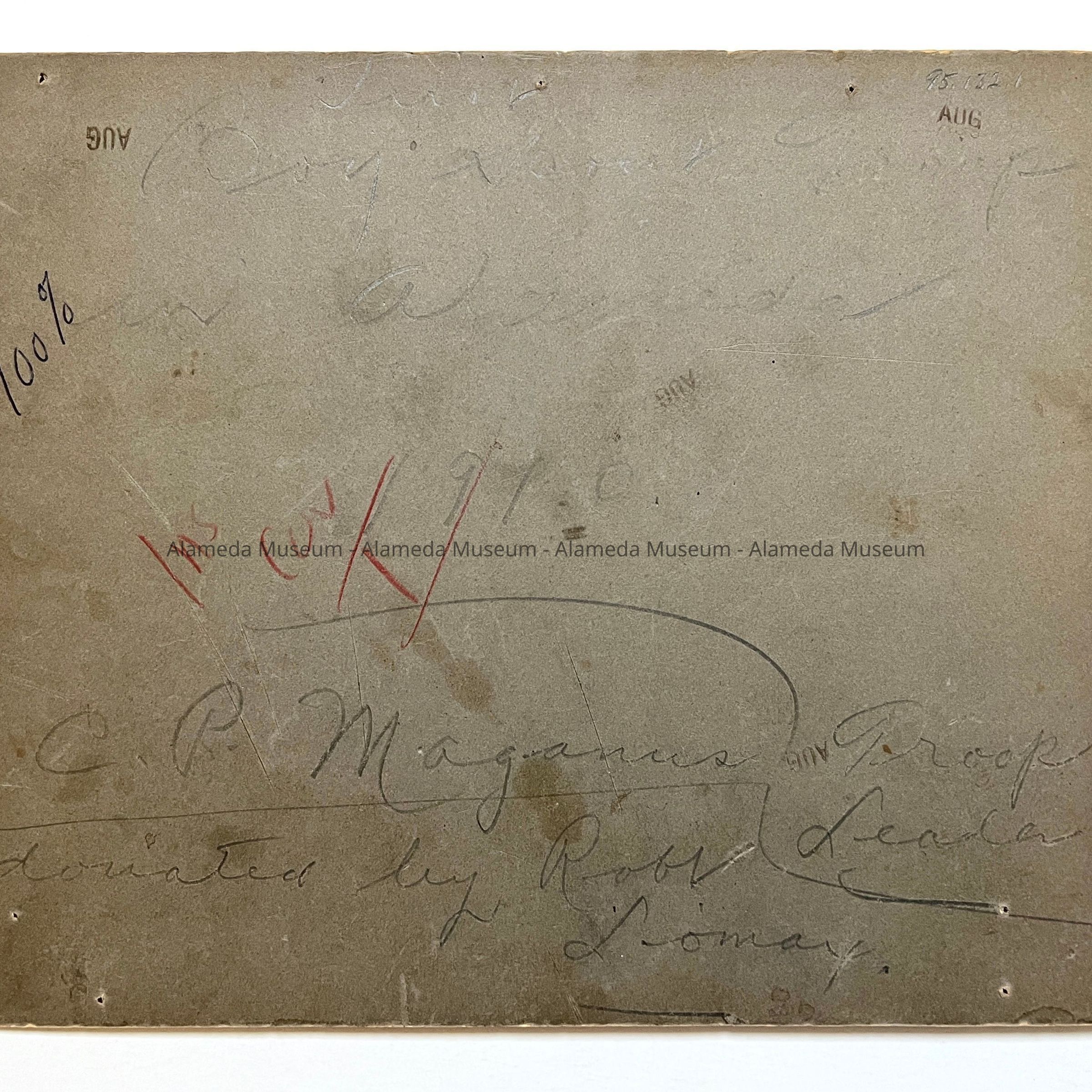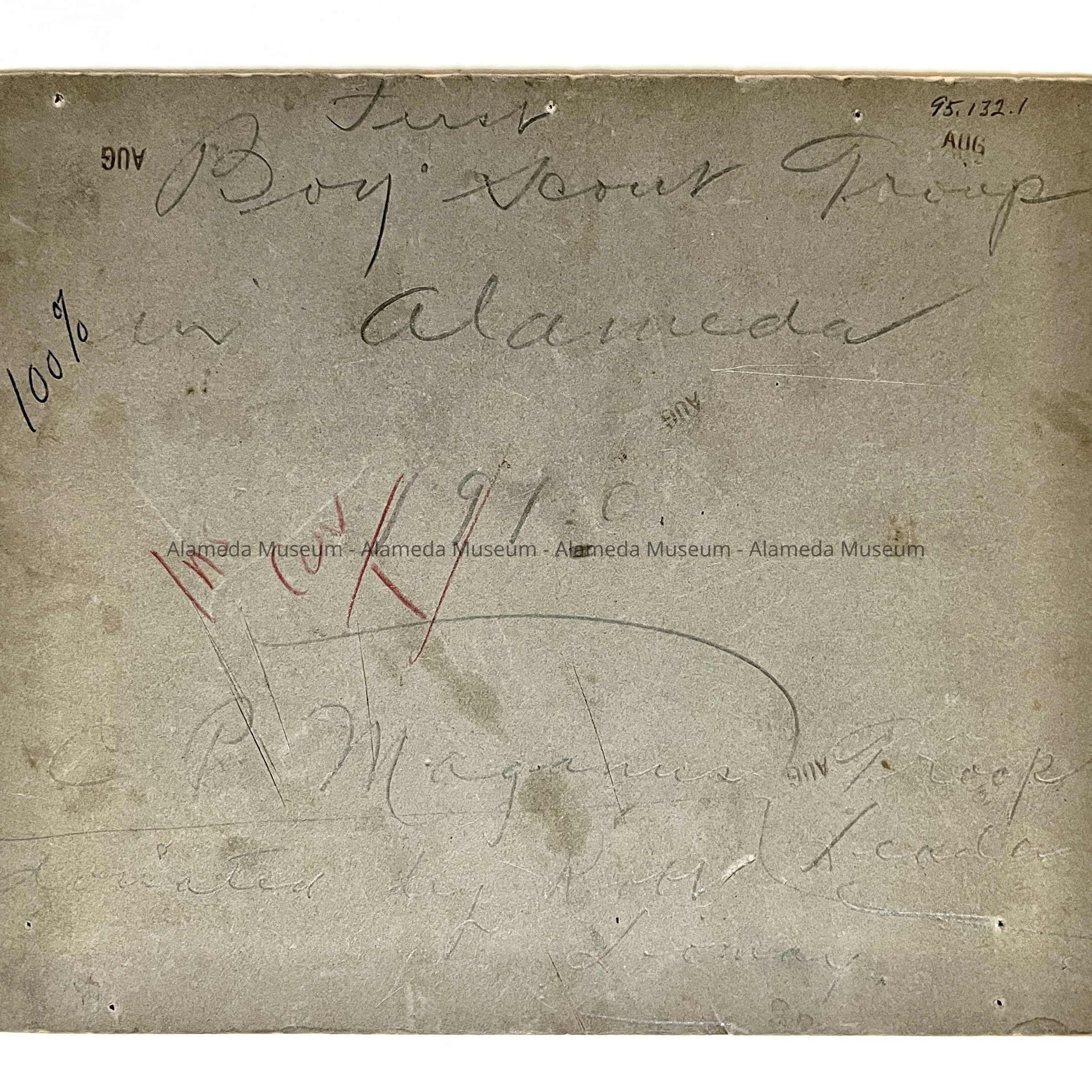 History of Object: Group identified as the first Boy Scout troop in Alameda shown gathered in a wooded area. C.P. Maganus is identified as the troop leader.