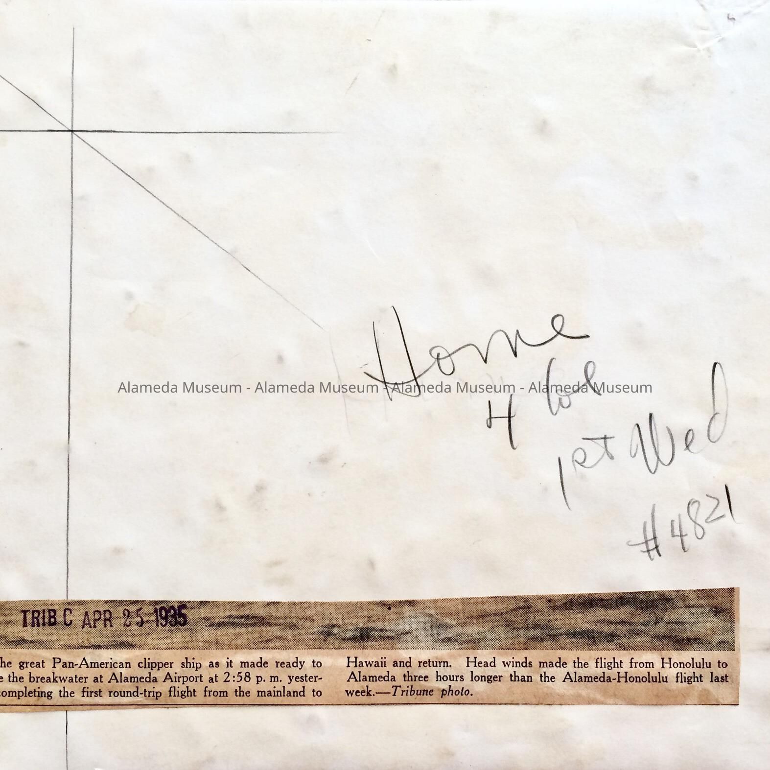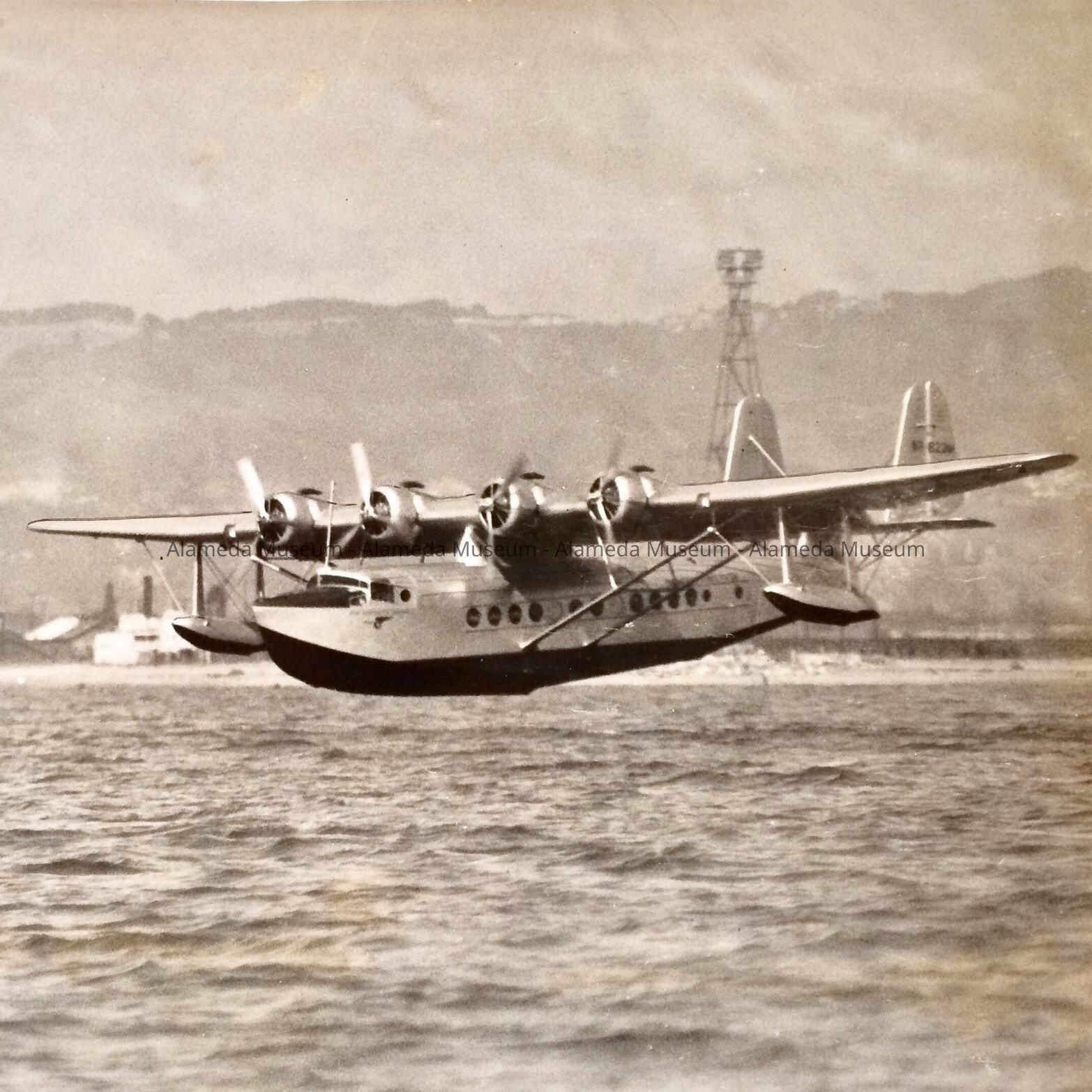 History of Object: A photograph of a Pan American clipper ship as it lands at the Alameda Airport, completing the first roundtrip flight from Hawaii to the mainland at Alameda.