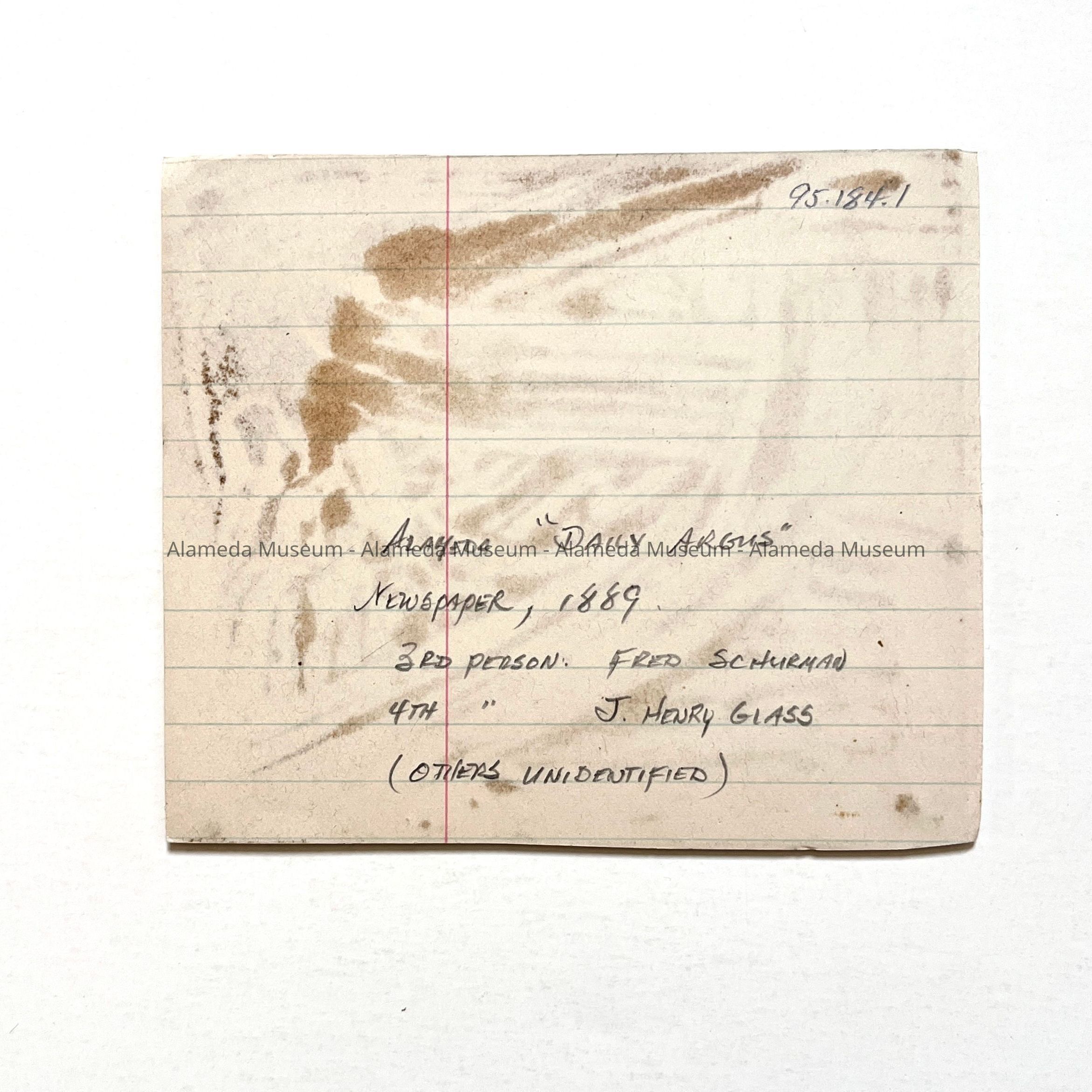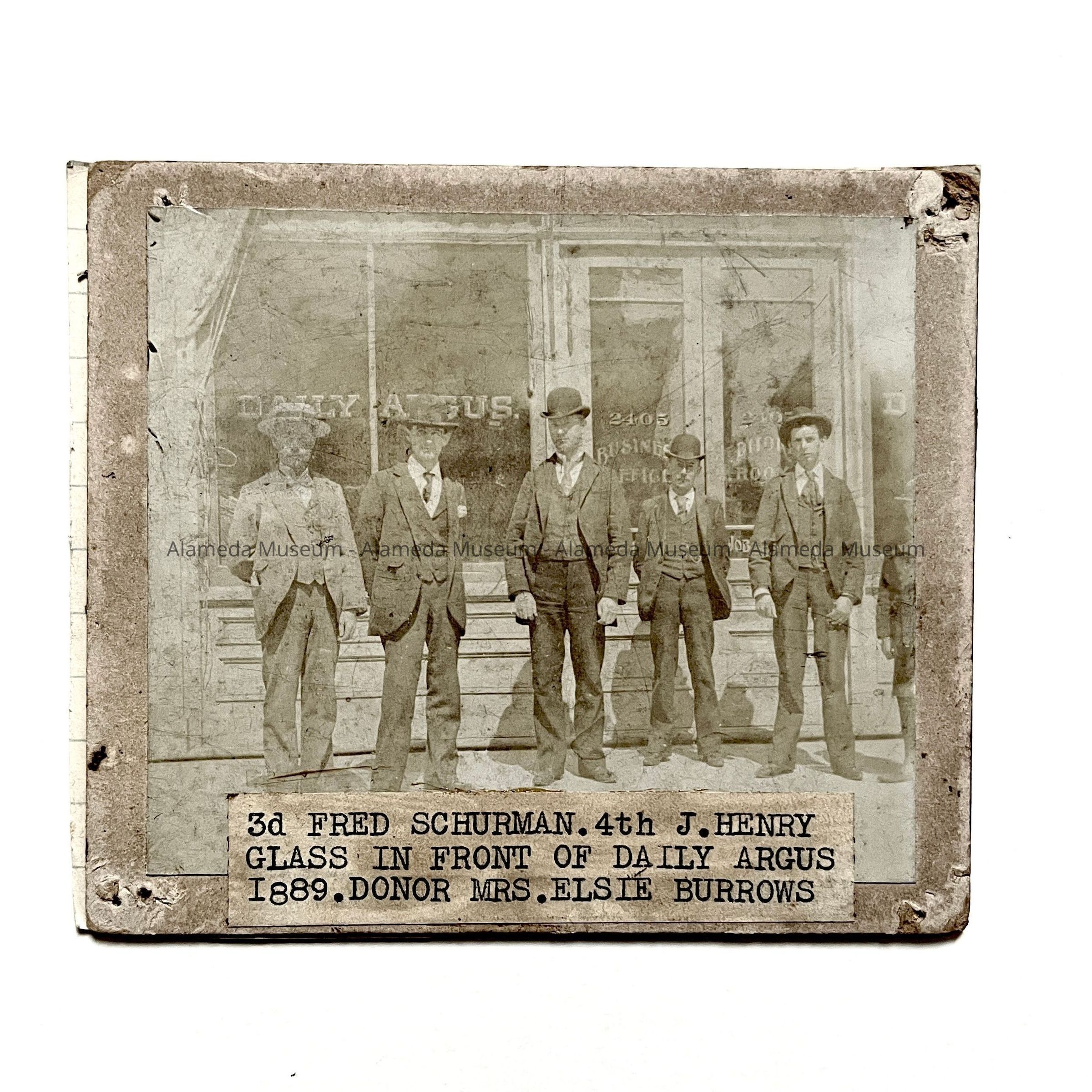 History of Object: Scene of a group of five men standing on the sidewalk in front of the Daily Argus business office. Two are identified: #3 - Fred Schierman, #4 - J. Henry Glan.