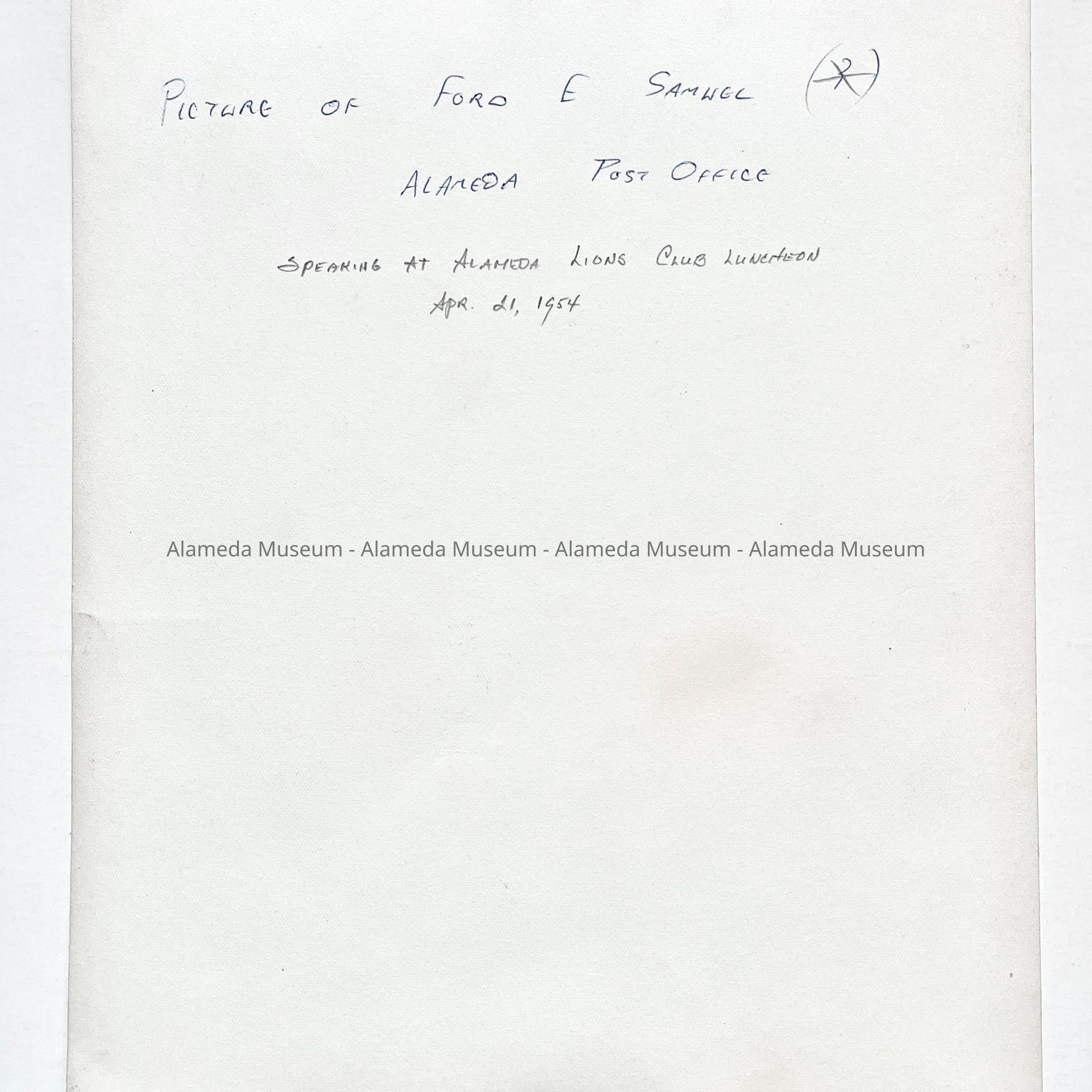 History of Object: View of the former Alameda Postmaster, Ford E. Samuel, speaking at an Alameda Lions Club luncheon, April 21, 1954.