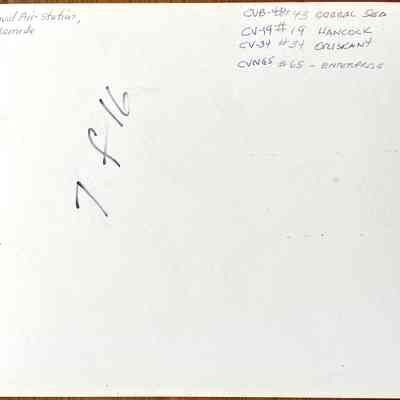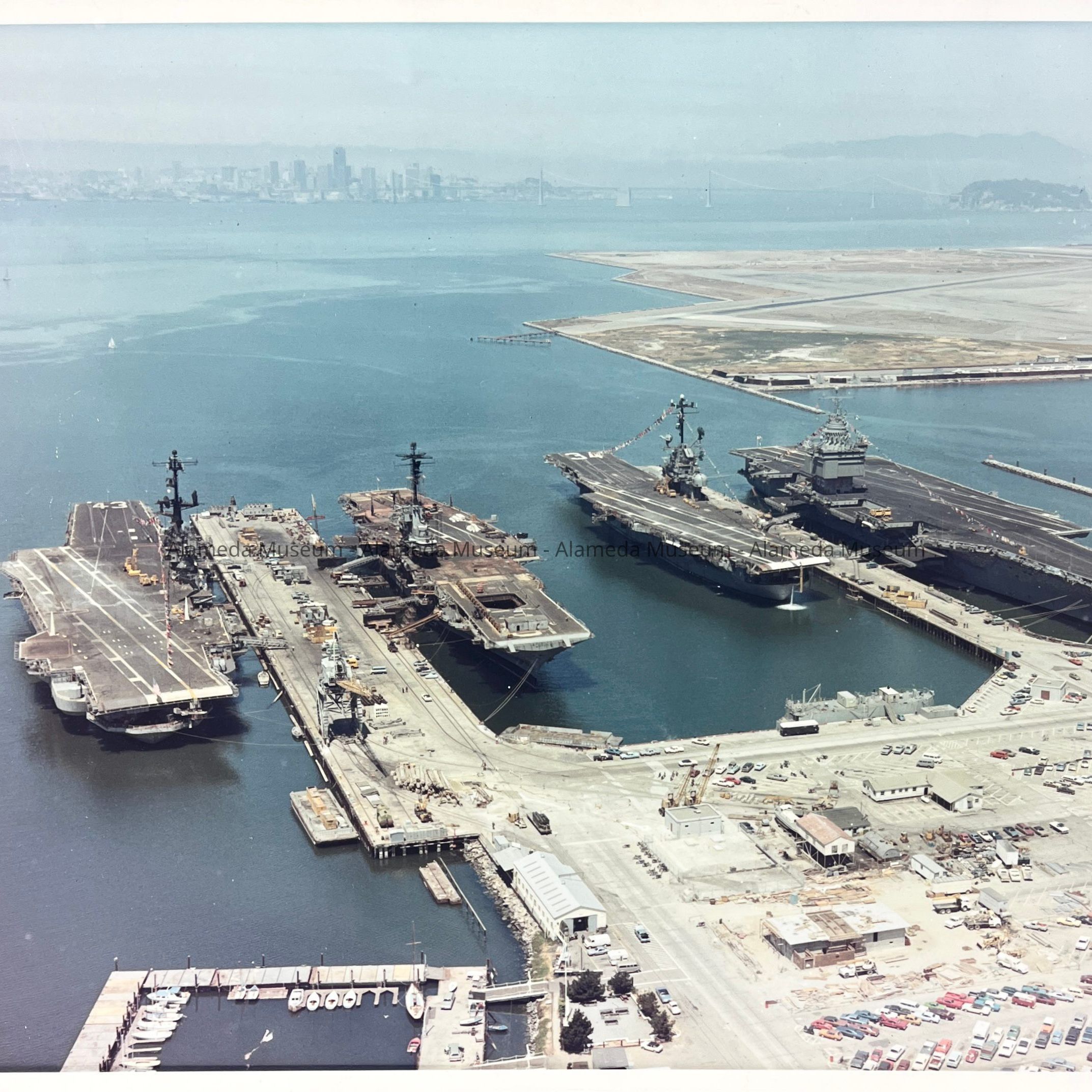A COLORED PHOTOGRAPH OF FOUR NAVAL AIR CARRIERS DOCKED ON THE MAIN SLIP. NAVAL VESSELS ARE AS FOLLOWS: USS CORAL SEA, USS HANCOCK; USS ORISKANY, AND THE USS ENTERPRISE.