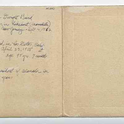 Description: Black and white photograph in a photograph coverlet of off white colored paper.