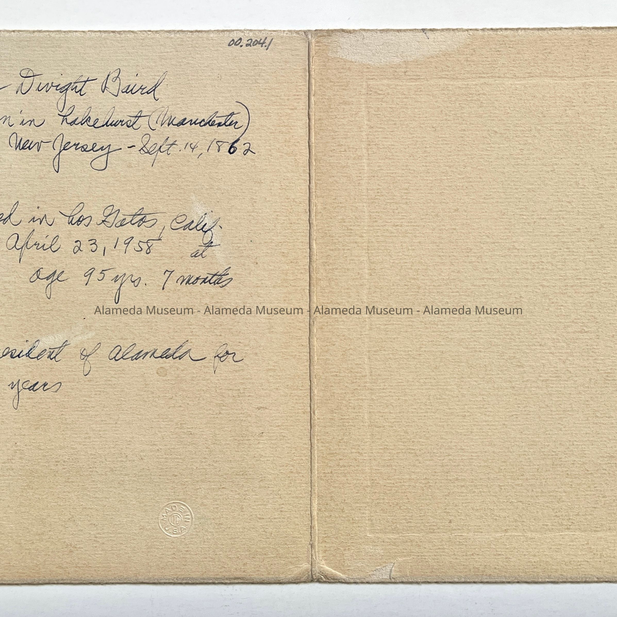 Given to the Alameda Historical Society prior to 1971 and never catalogued.