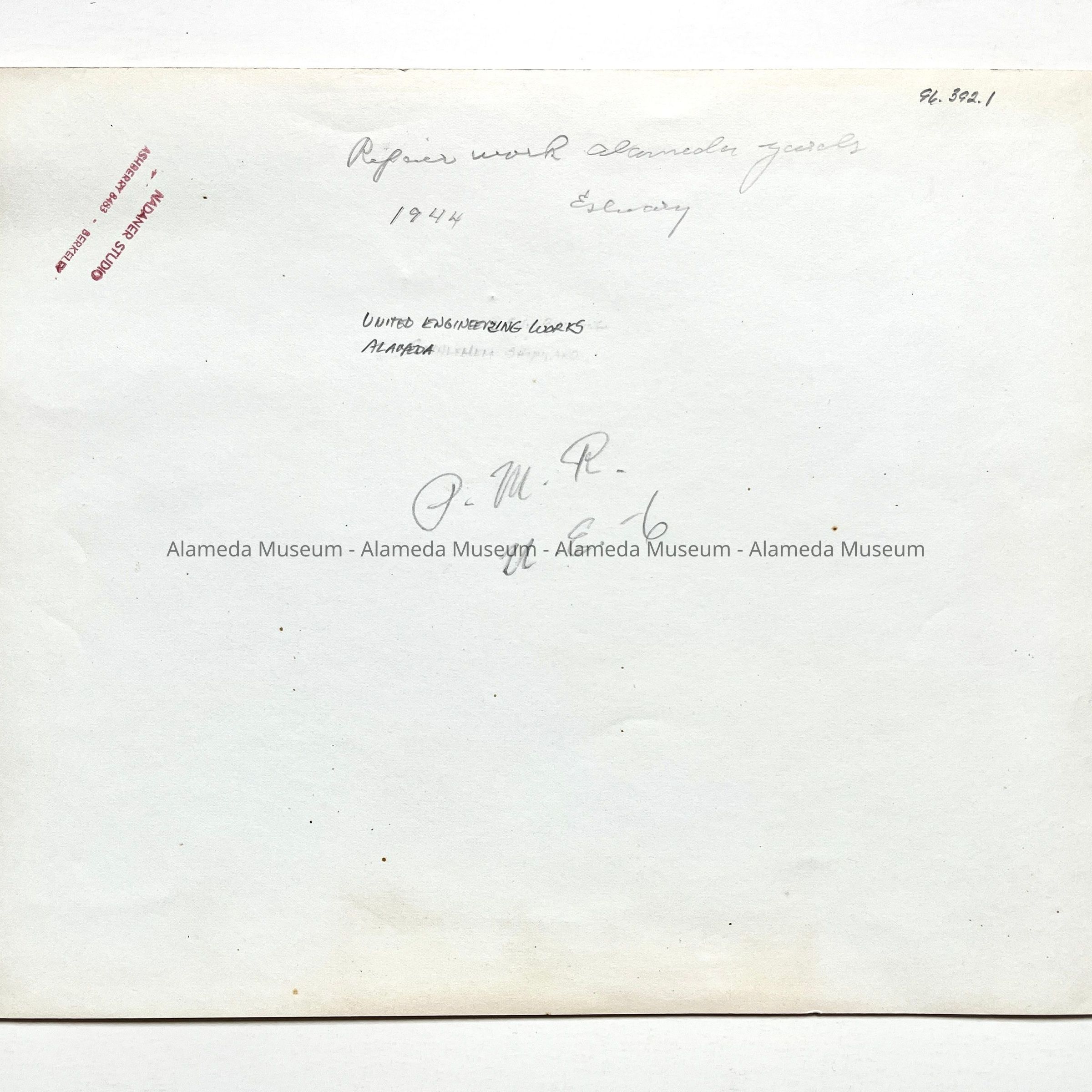 Description: Glossy black/white photograph, unmounted. Photographer: Nadaner Studio, Berkeley, CA. A typed description label is affixed to the bottom edge of the image.