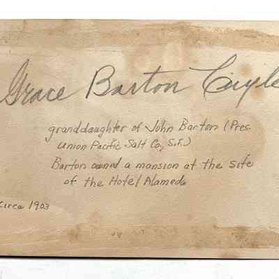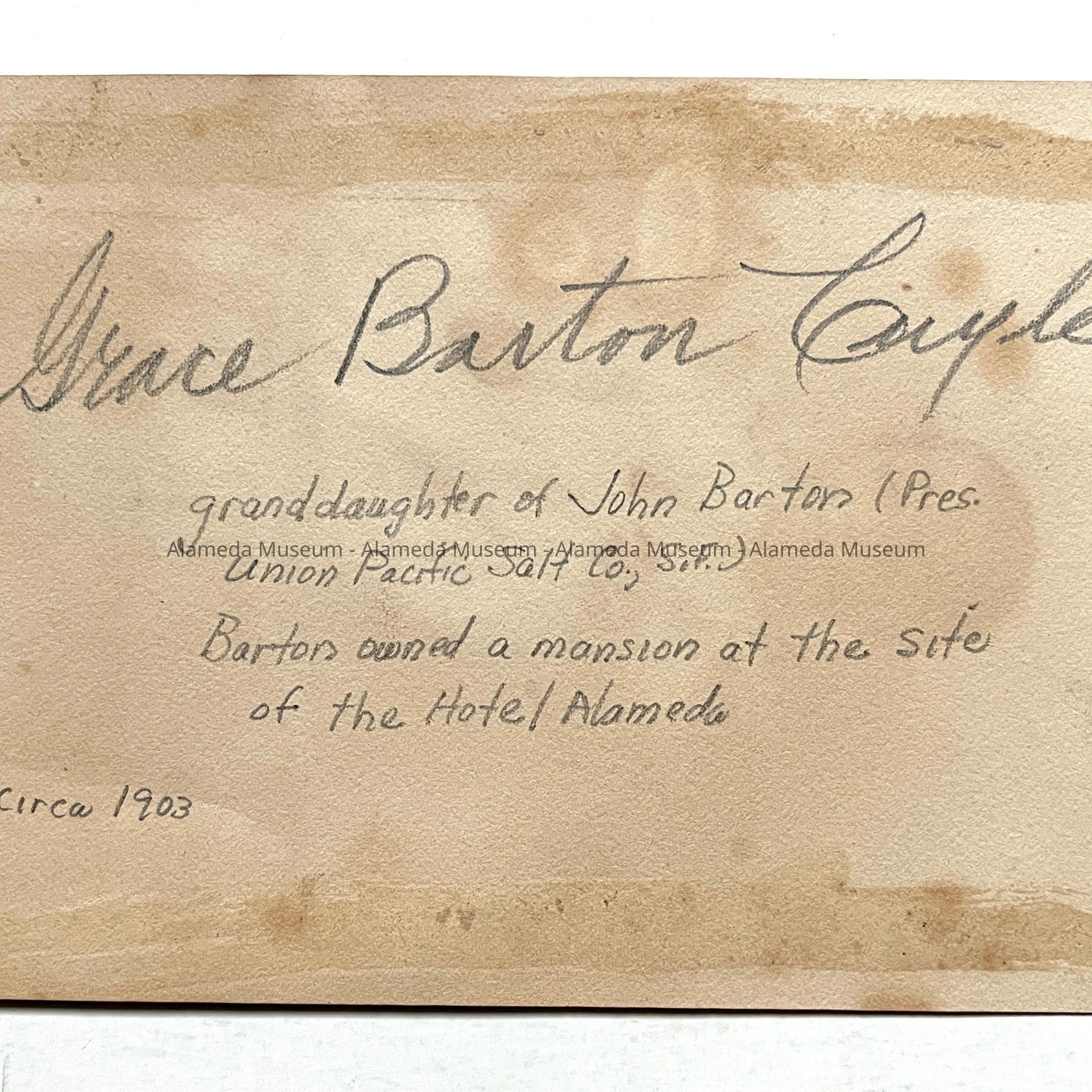 Photograph of Grace Barton Cuyler, born July 19, 1902 and granddaughter of John Barton, who was president of Union Pacific Salt Co., San Francisco, and occupied a mansion at the site of the Hotel Alameda.