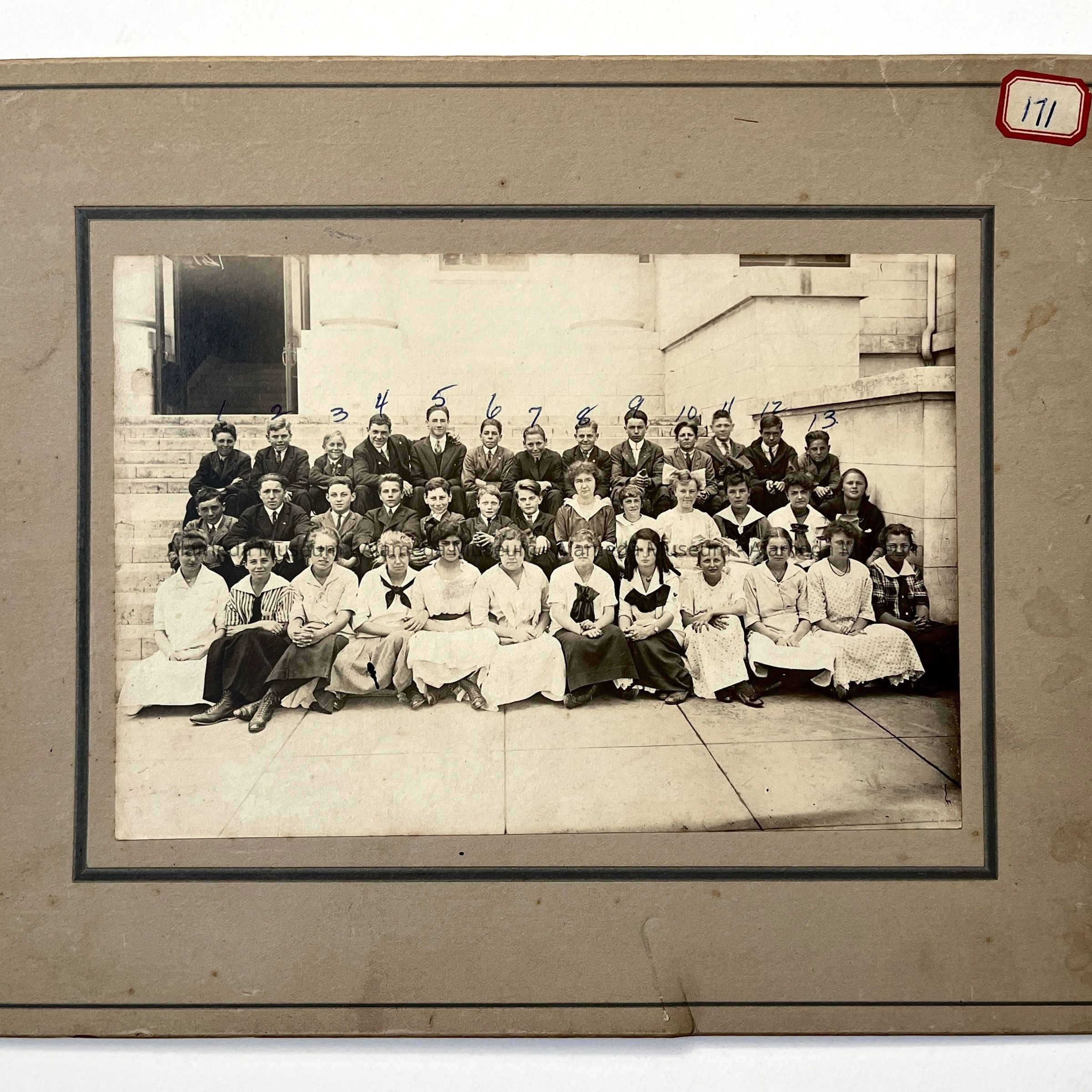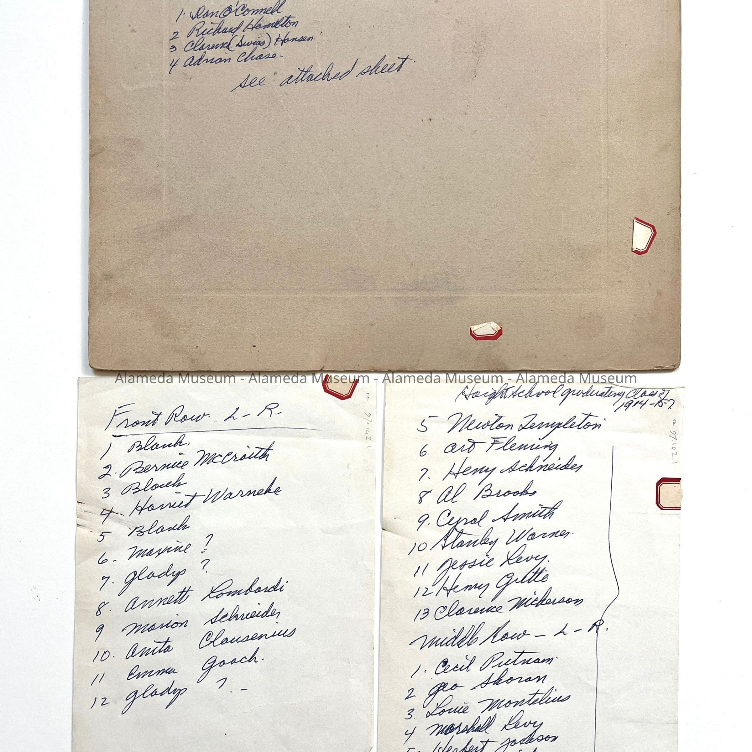 History of Object: haight School graduating classes of 1914, 1915 and 1917. Members are partially identified by a list written on verso plus two pages of names written on white sheets of paper attached by a paper clip.