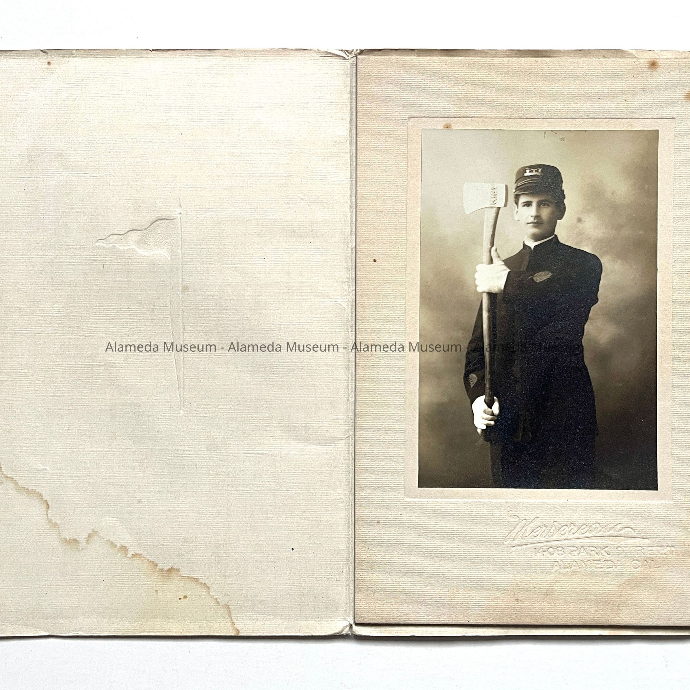 Black and white photograph on white colored mounting with embossed signature Mersereau, 1408 Park St., Alameda, CAL. Photograph housed in an original white paper jacket.
