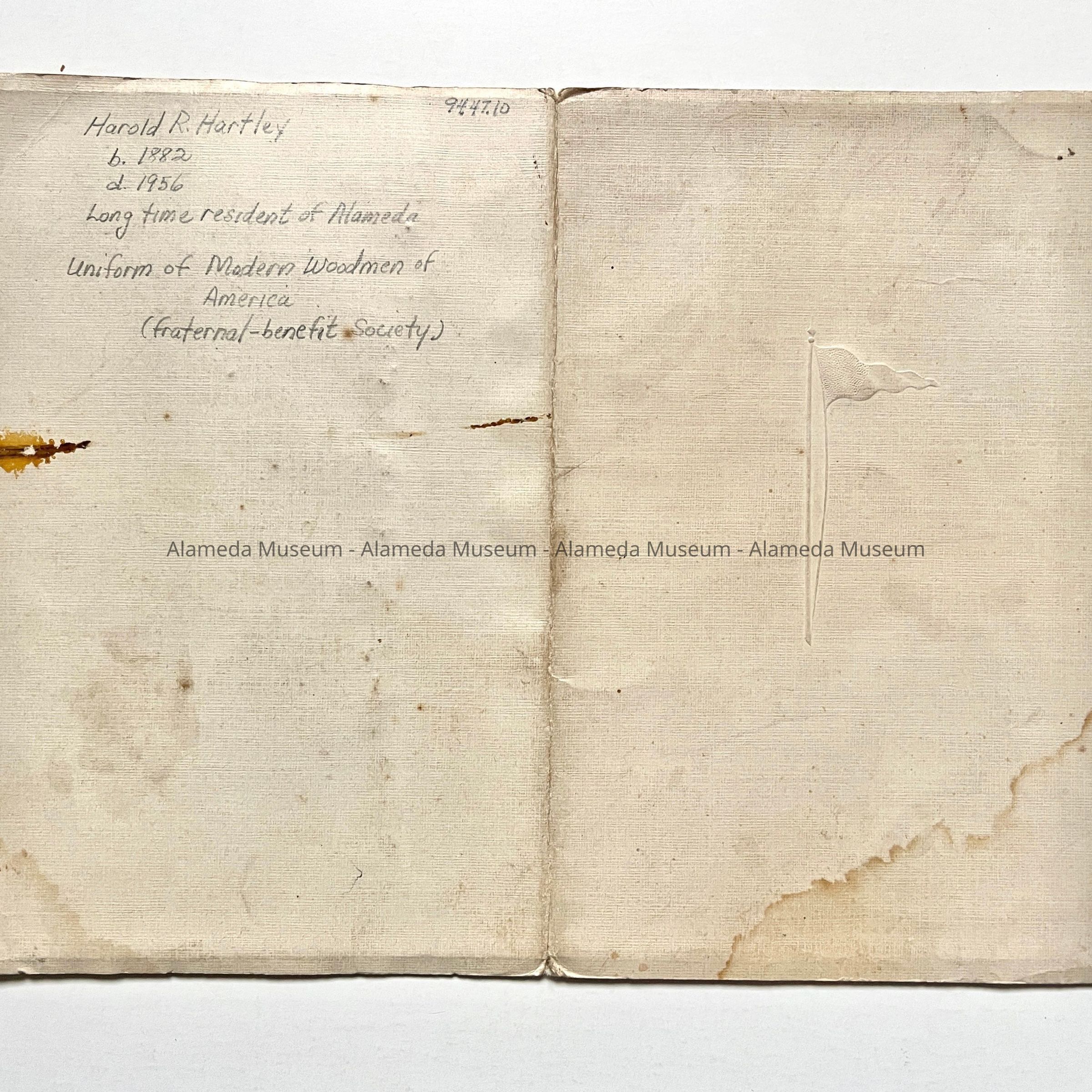 Photograph of Harold R. Hartley, born 1882 died 1956. Longtime resident of Alameda. Hartley is pictured wearing the uniform of the Modern Woodmen of America. (Fraternal Benefit Society). Harold R. Hartley is the father of the donor.