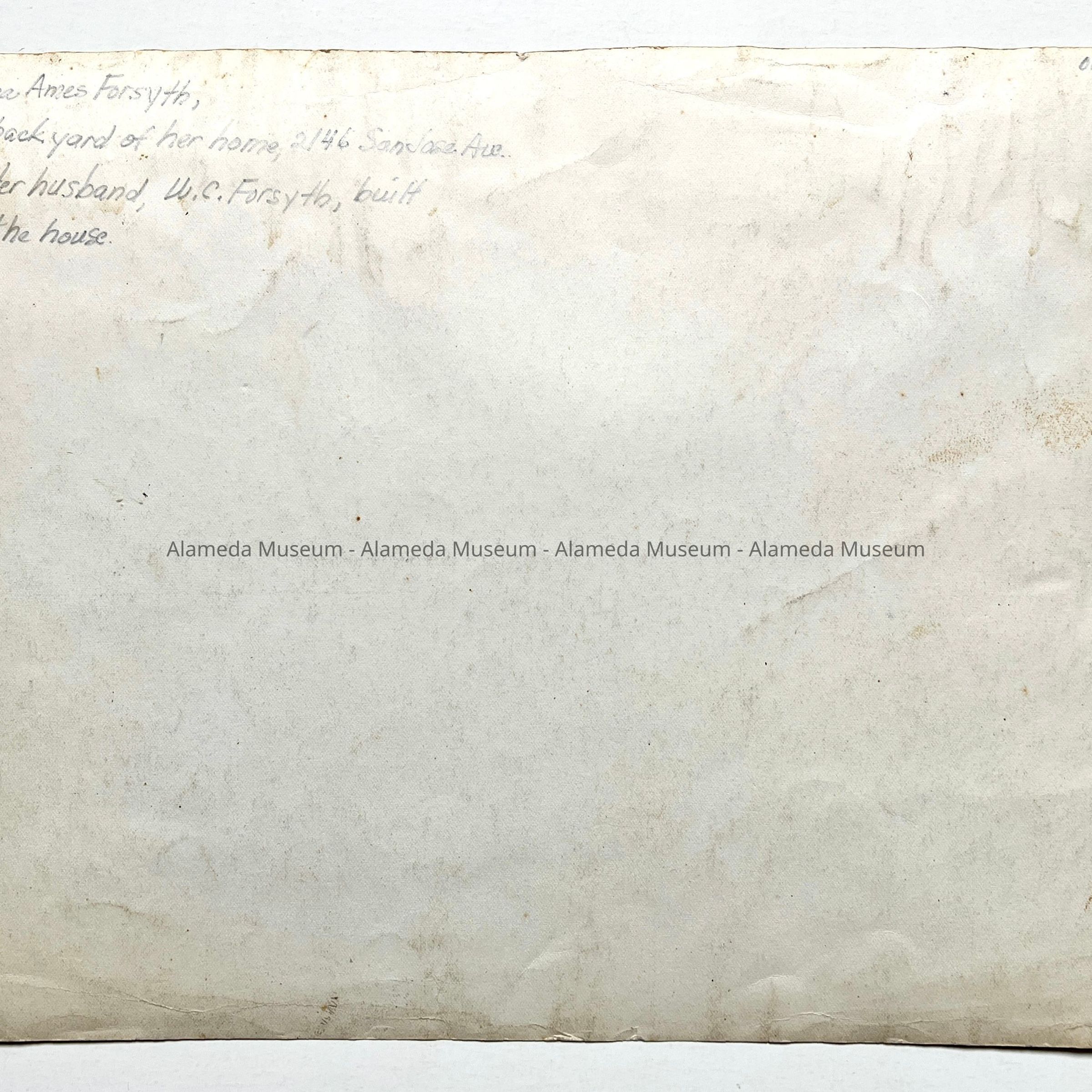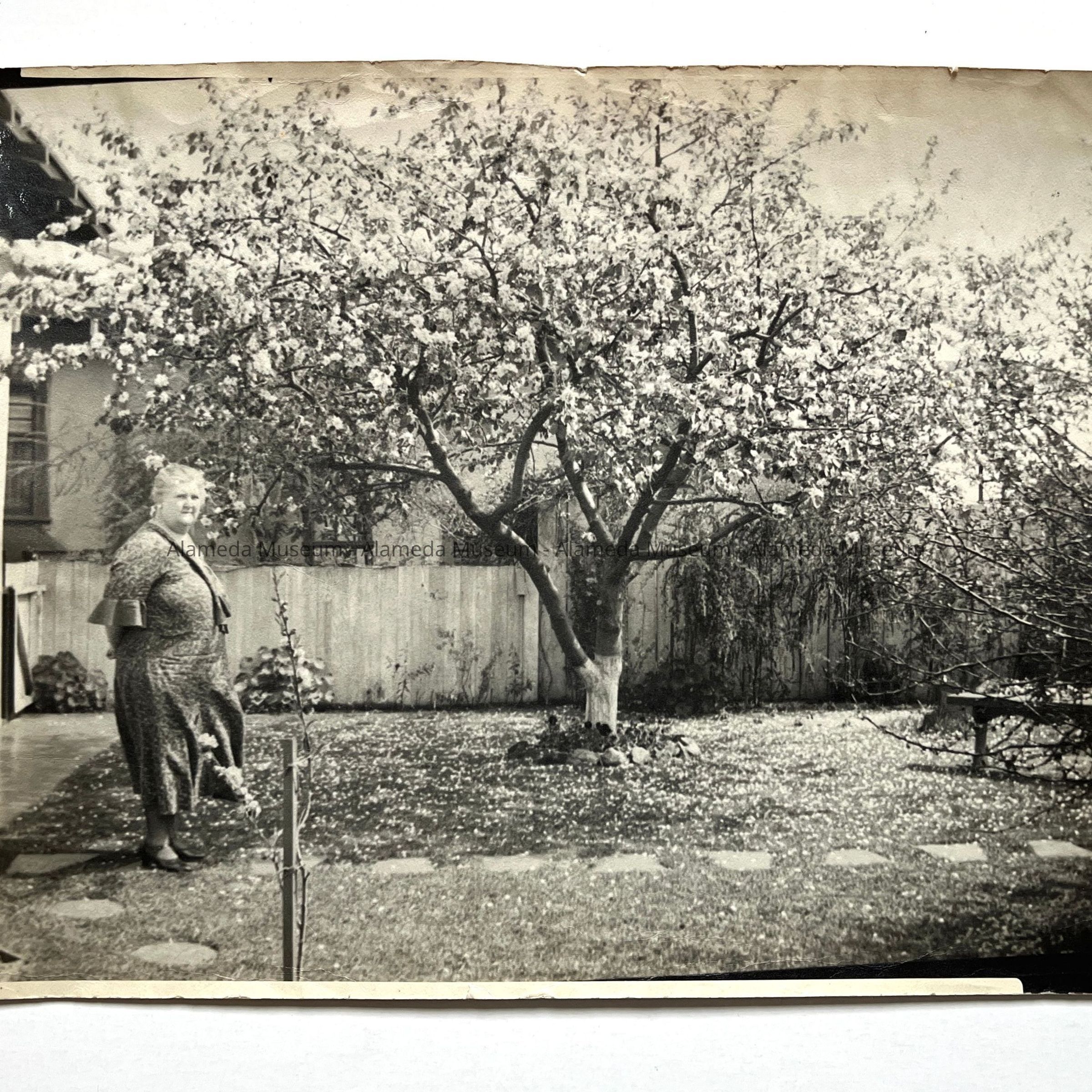 A PHOTOGRAPH OF HELENE AMES FORSYTHE, STANDING IN THE REAR YARD OF HER HOME AT 2168 SAN JOSE AVENUE, ALAMEDA.