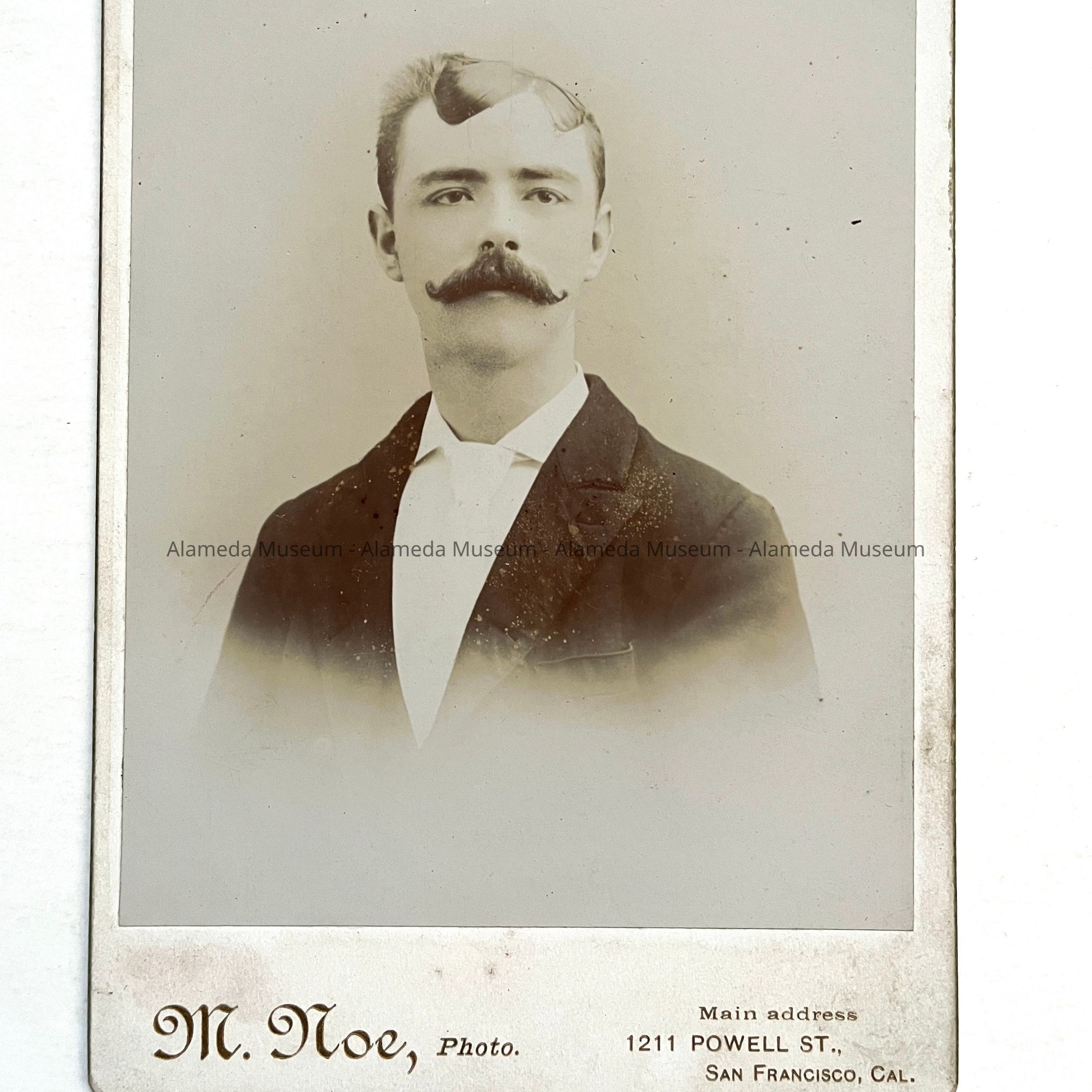 SEPIA-TINTED CABINET-SIZE PORTRAIT PHOTOGRAPH. PHOTOGRAPH HAS A WHITE-COLORED BORDER, WITH CAPTION, "M. NO. PHOTO, 1201 POWELL ST, SF, CAL.".