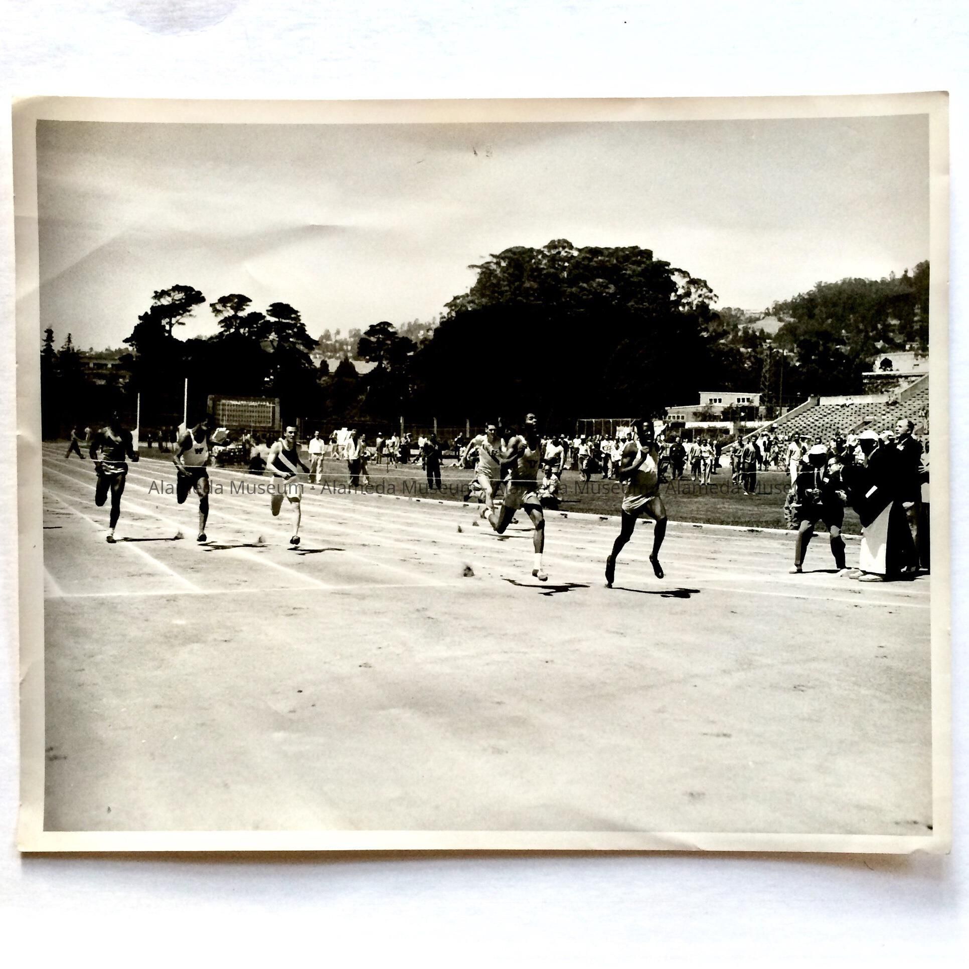 AN ACTION PHOTO OF RUNNERS AT A BERKELEY TRACK IN 1954. THEY WERE CHAMPION RUNNERS. CAPTION READS, "JACKSON BEATING KING, MAY 29, 1954.".