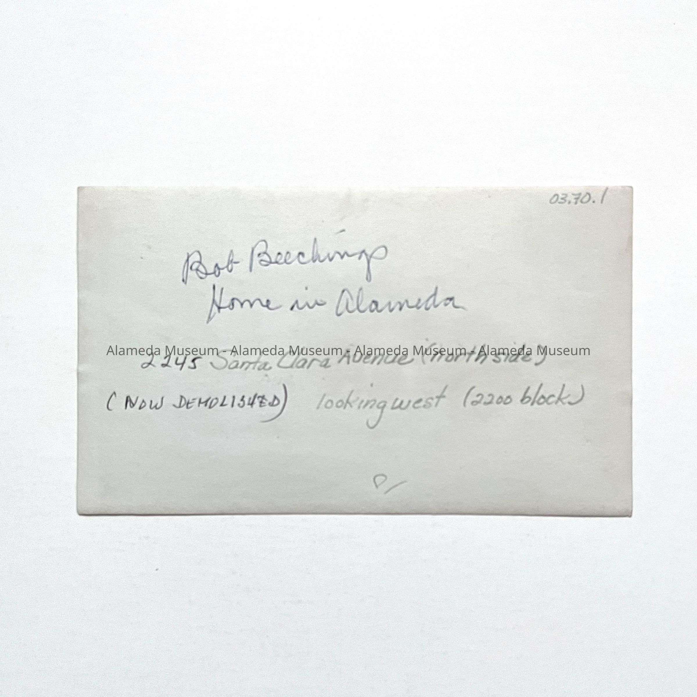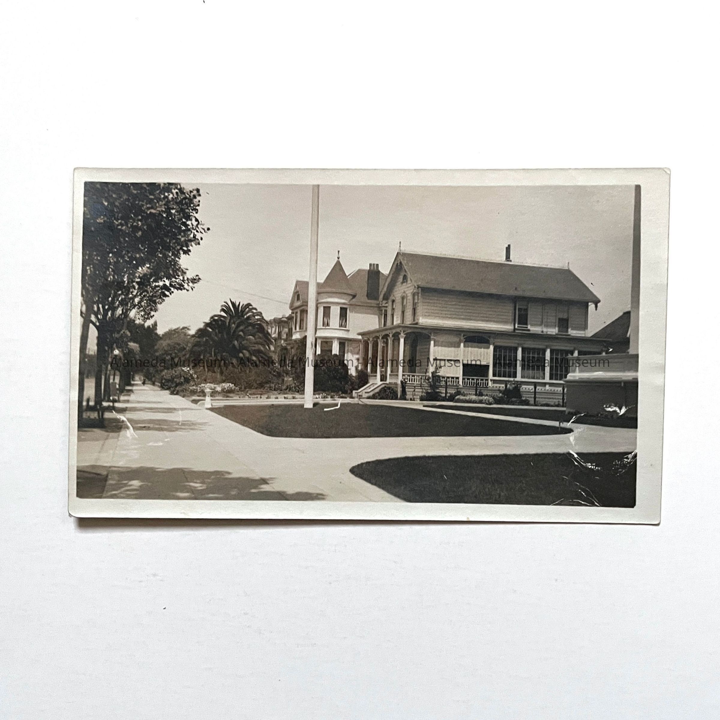 HISTORY OF OBJECT: PHOTOGRAPH OF THE HOMES (SINCE DEMOLISHED), WHICH ADJOINED THE ALAMEDA ELKS' BUILDING; ERECTED 1909. THE PHOTOGRAPH ALSO DEPICTS THE NORTH SIDE OF SANTA CLARA AVENUE IN THE 2200 BLOCK, LOOKING WEST.