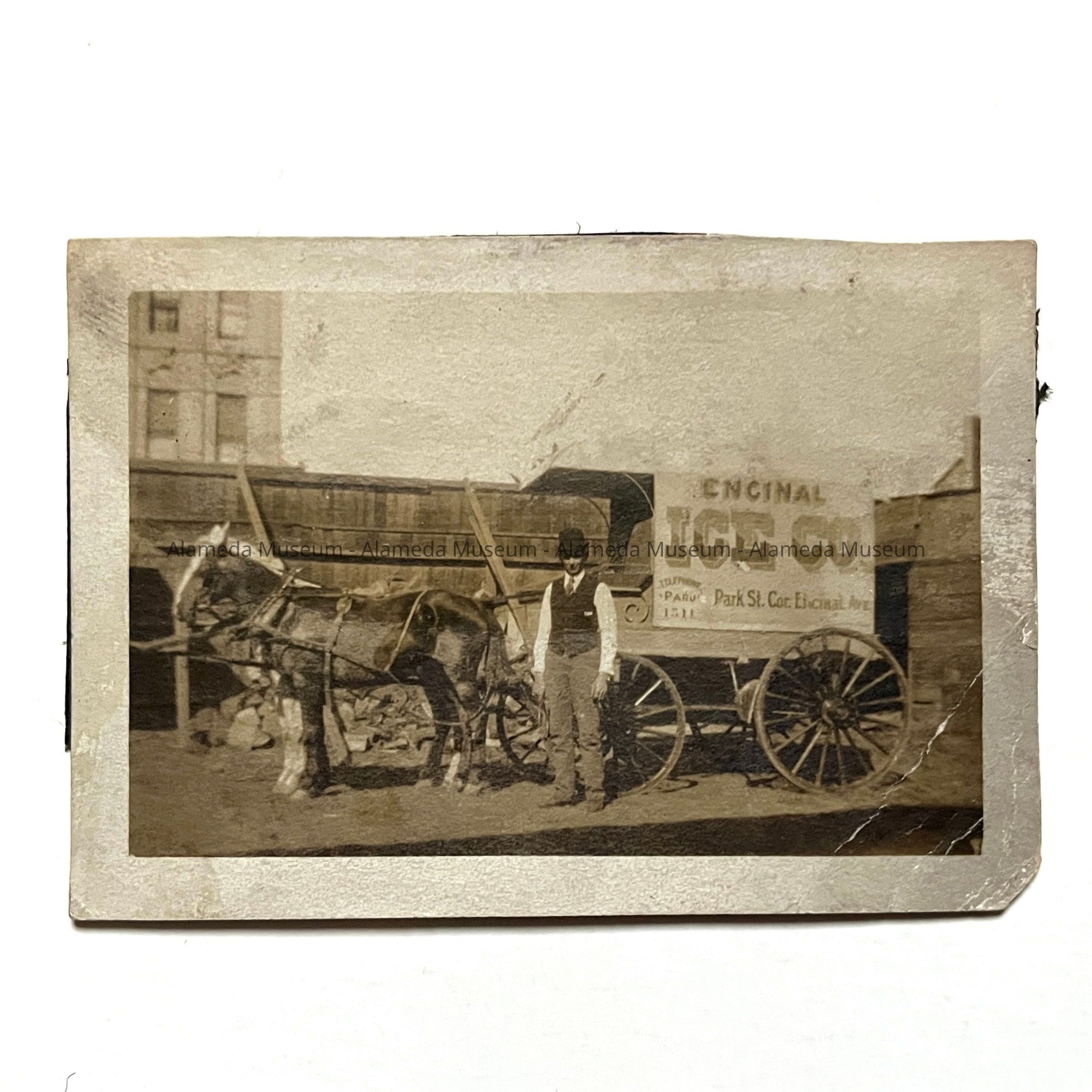 History of Object: Photo of a horse & wagon in the yard of the Encinal Ice Company depot, northeast corner of Park Street & Encinal Avenue.