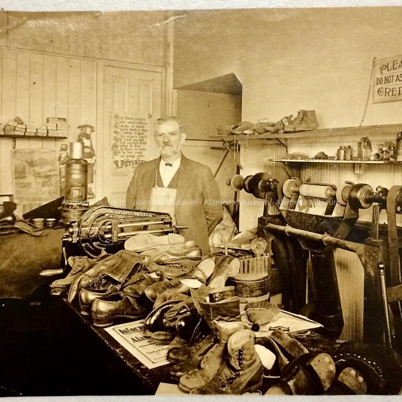 AN INTERIOR PHOTO OF ANDREW PETERSEN AT 2106 LINCOLN AVENUE WHERE HE OPERATED A SHOE REPAIR SHOP.