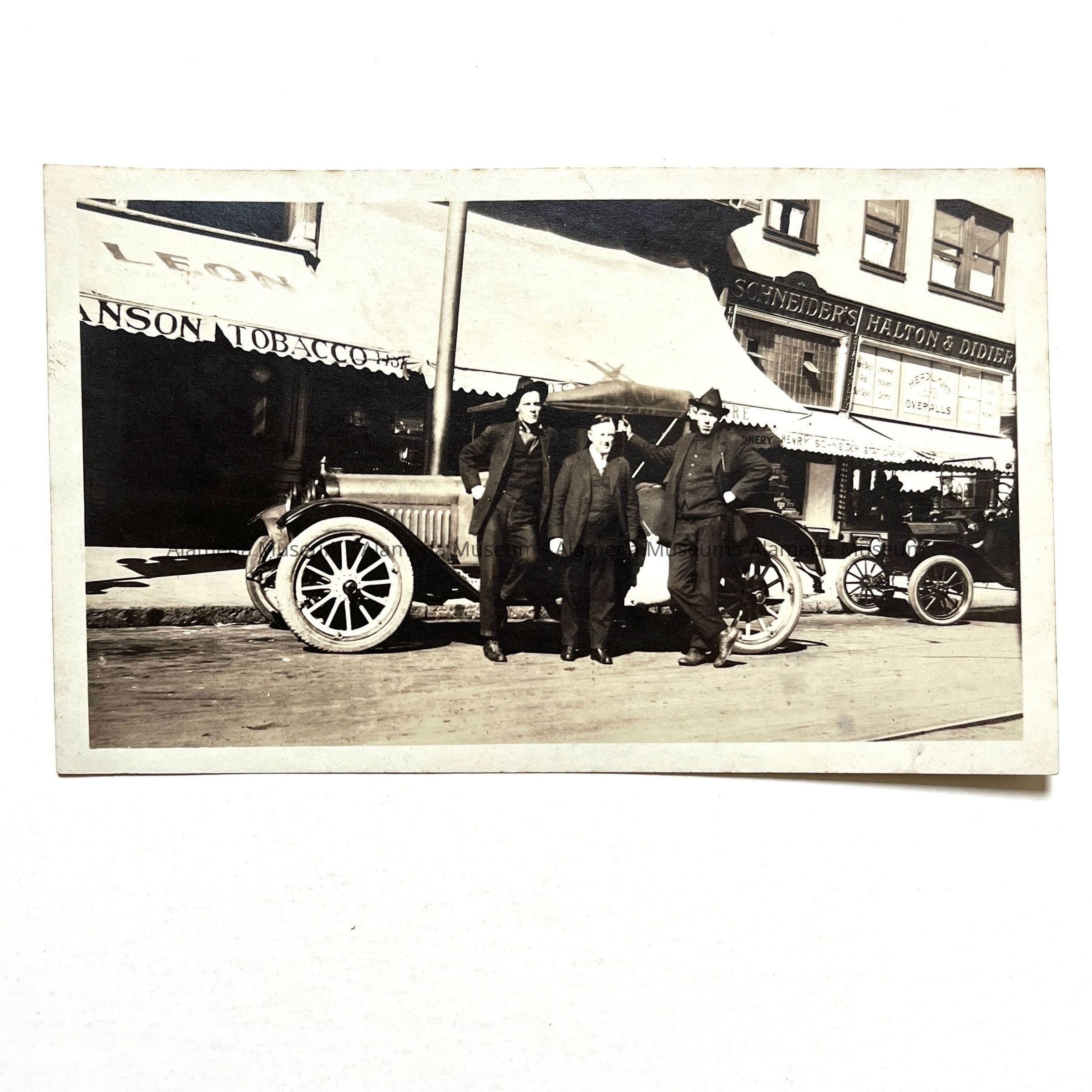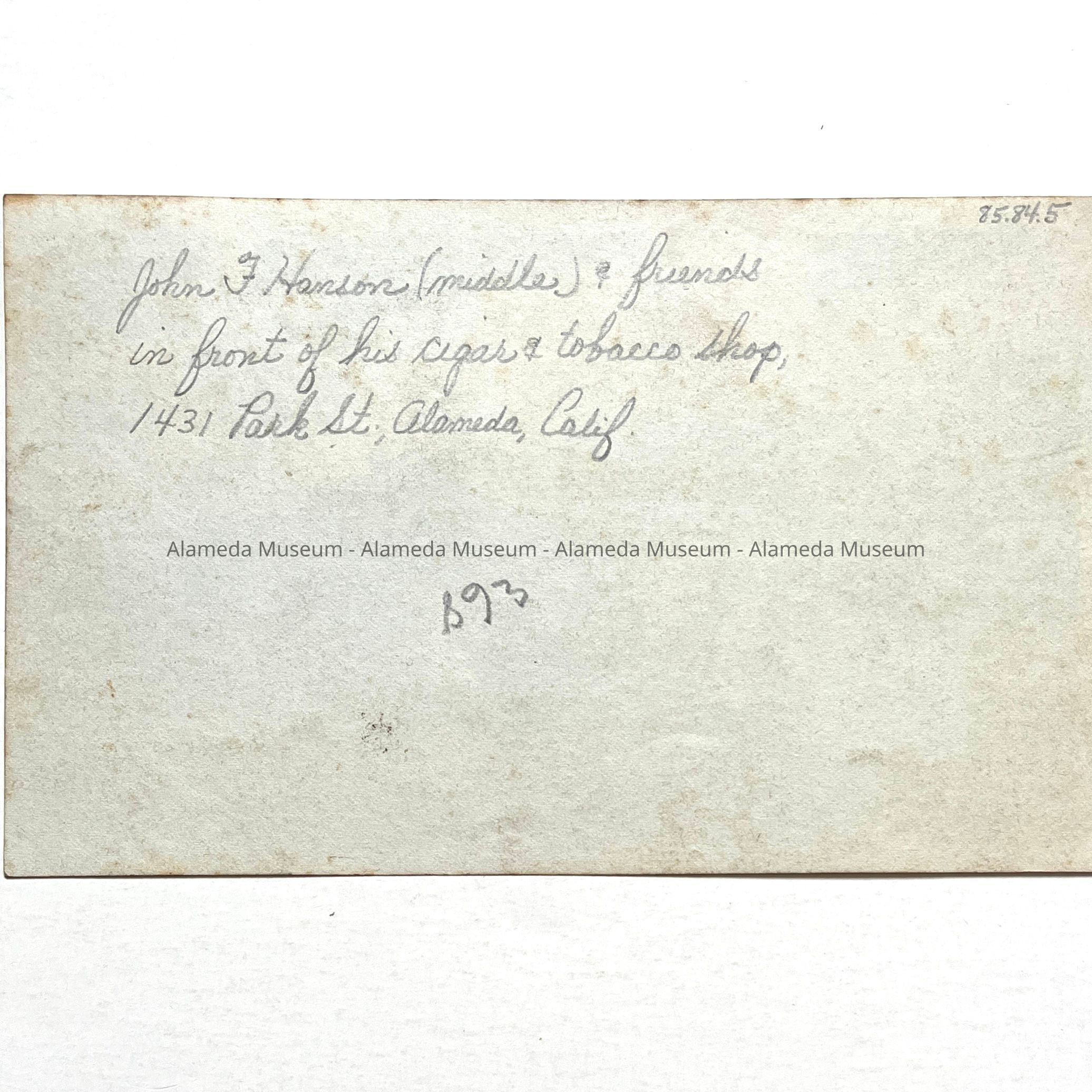 History of Object: Photo of: The proprietor J. F. Hanson and two friends standing in front of his cigar & tobacco shop at 1431 Park Street, Alameda.