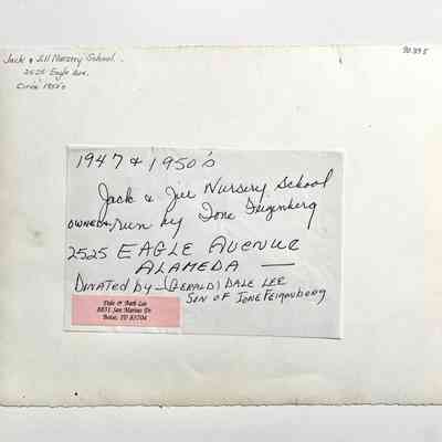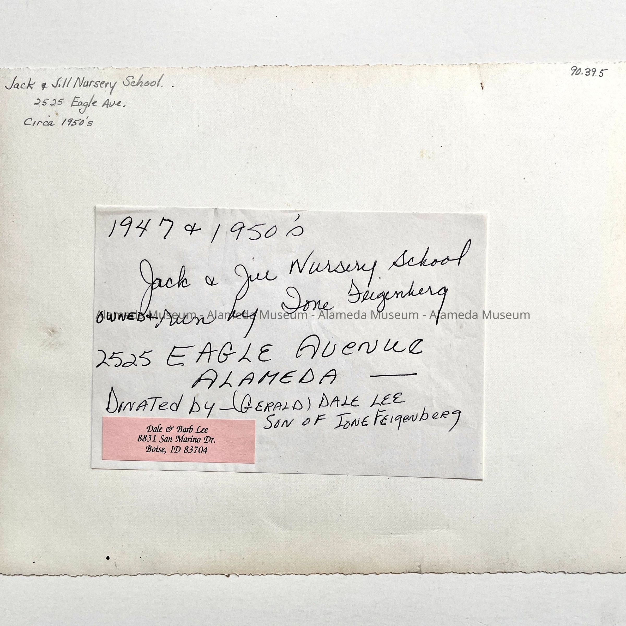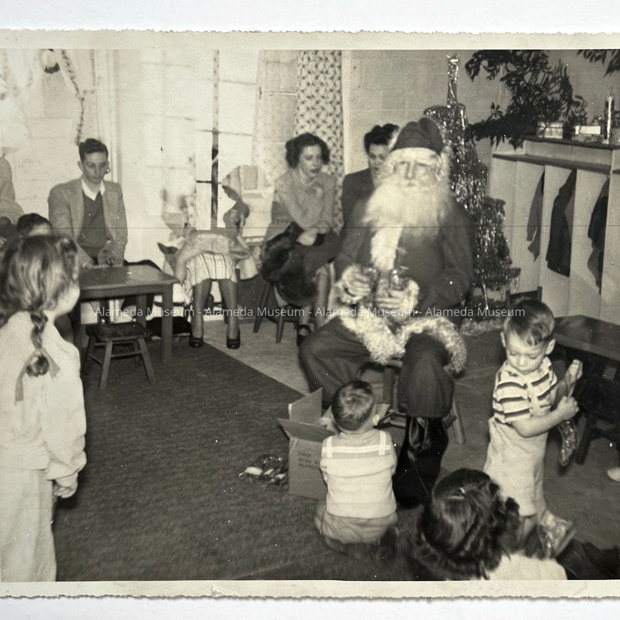 History of Object: Photograph depicting students at a private nursery school Christmas party. The school, "Jack & Jill Nursery School," was operated by Ione Feigenberg, from 1947 into the 1950's. Owned and run by Mrs. Feigenberg, the nursery school was located at 2525 Eagle Avenue.