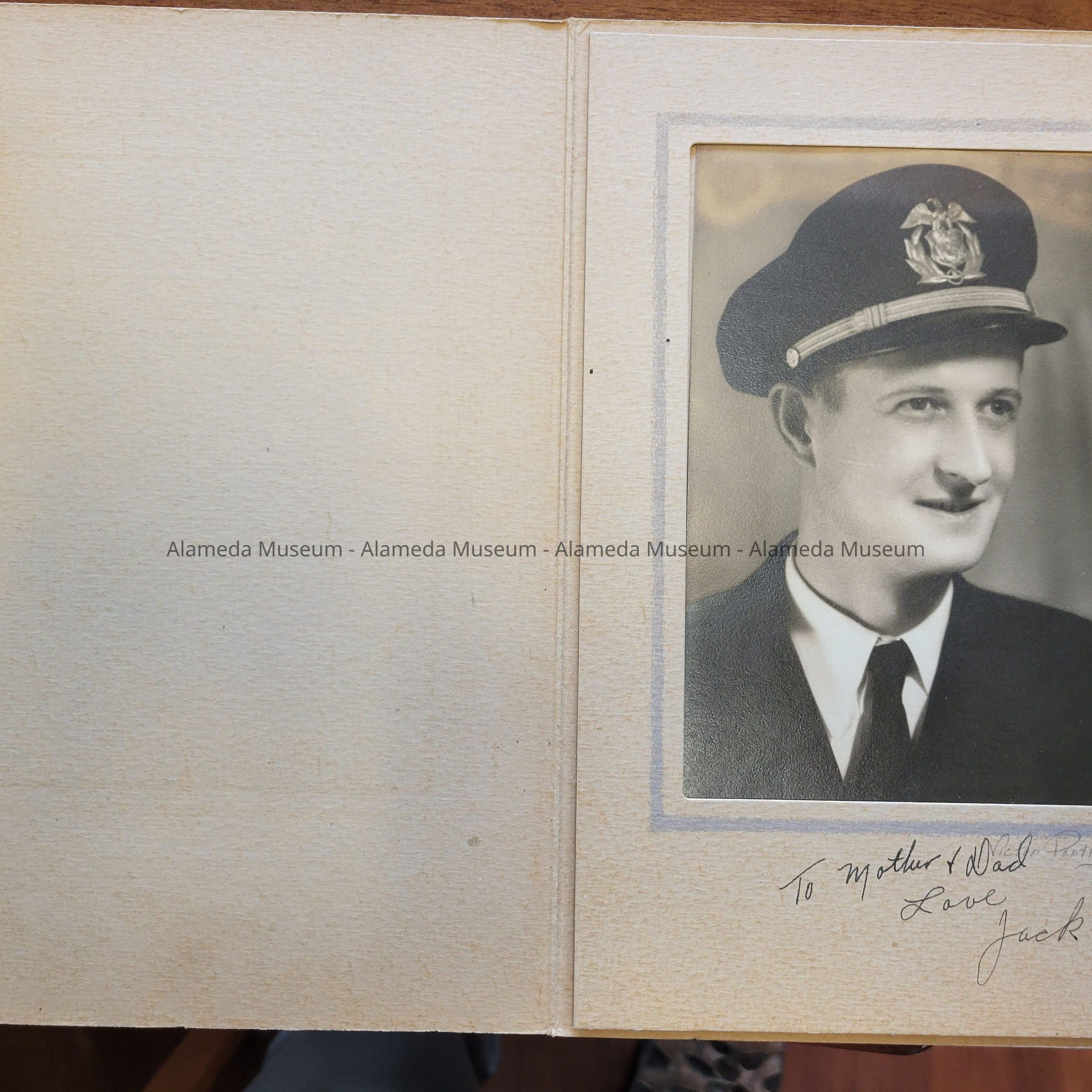 Description: 5x7 sepia-colored black-and-white photo, in tan card stock folder, with gray line around the photo opening. Under opening is written in pencil: ‘Victor Portraits’, and, partially overlapping, in ink-pen: ‘To Mother + Dad/Love/Jack’. Outside of card stock has marbled appearance.
