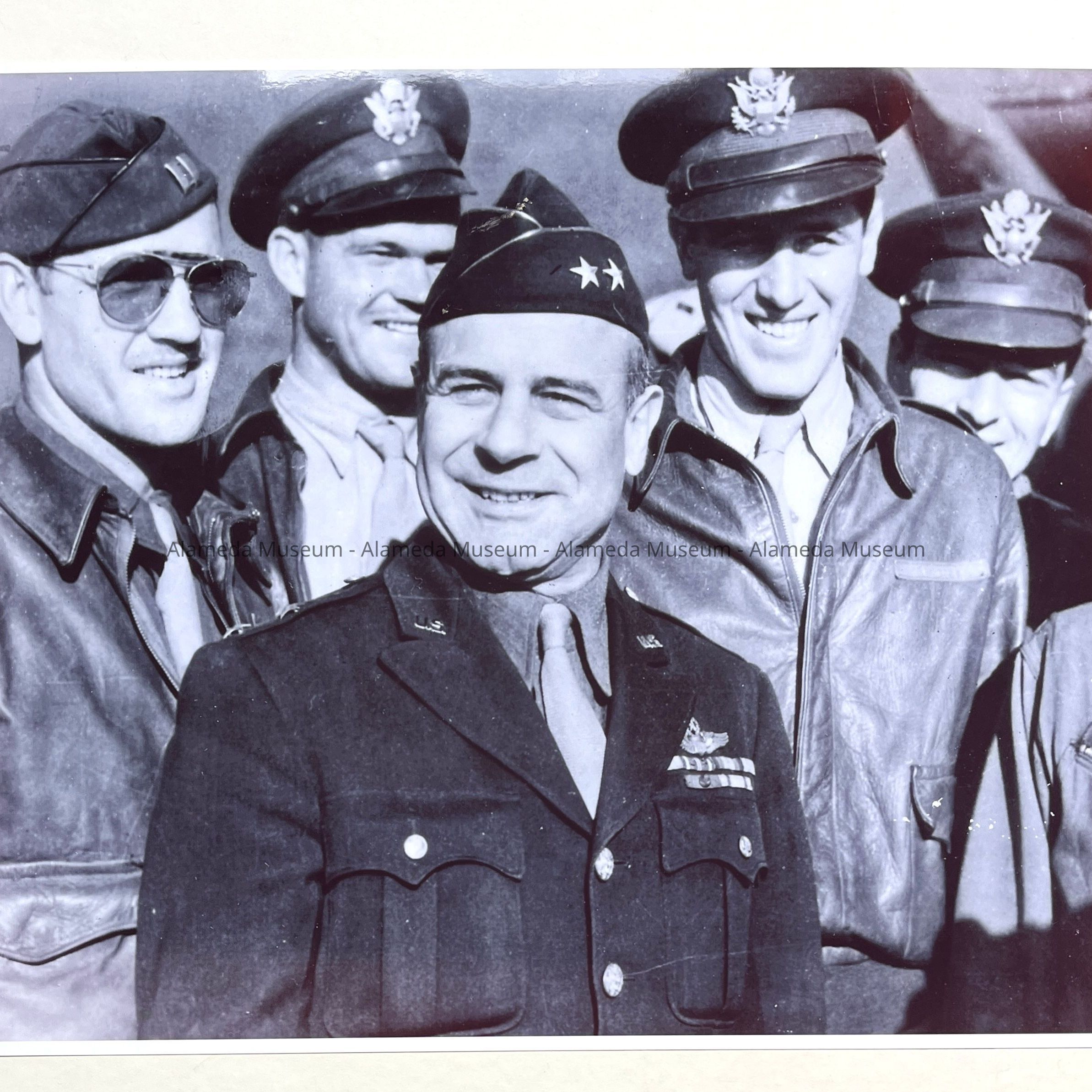 History of Object: A photo of James Doolittle surrounded by unidentified military colleagues. He was a native of Alameda and is famous for having led the first bombing raid on Tokyo during WWII.