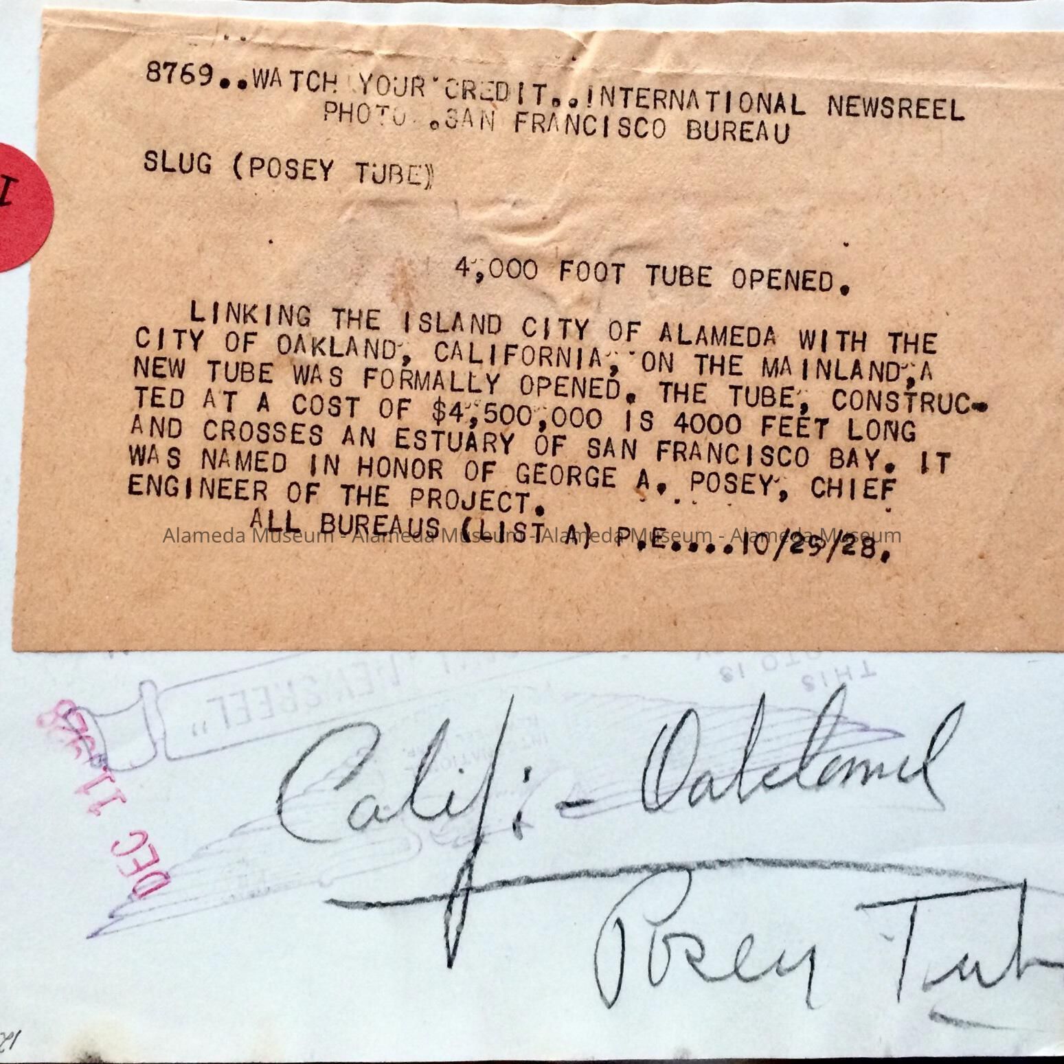A BLACK-AND-WHITE PHOTOGRAPH DEPICTING THE LAST STAGES OF PREPARATION FOR THE CONSTRUCTION OF THE POSEY TUBE LINKING ALAMEDA WITH OAK LAND. THE PHOTO IS DATED DECEMBER 11, 1928 AND WAS ISSUED BY THE INTERNATIONAL NEWSREEL PHOTO, SAN FRANCISCO BUREAU.