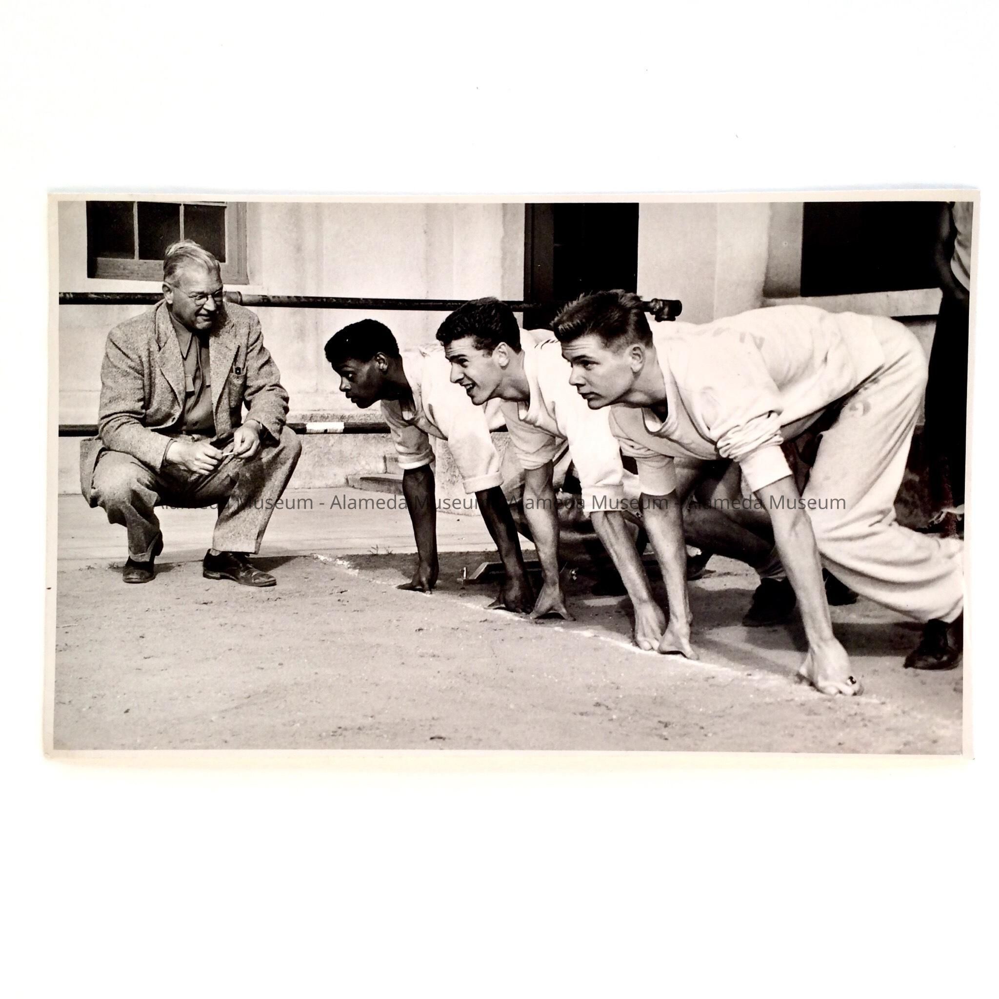 A PHOTO OF LEWIS C JOLLEY, WITH THREE UNIDENTIFIED ATHLETES AT THE STARTING LINE, ALAMEDA HIGH SCHOOL. MR JOLLEY WAS THEIR COACH.