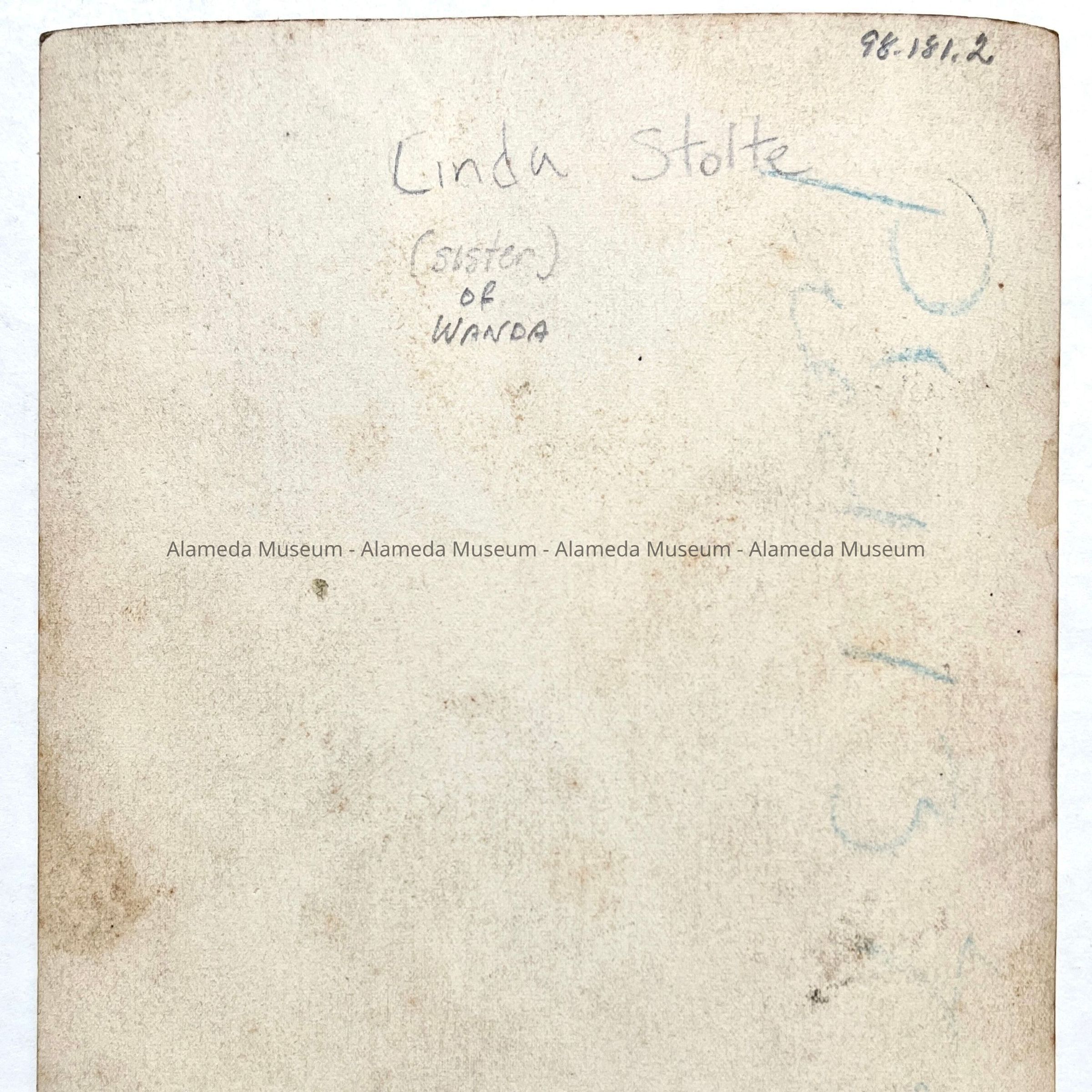 Description: Black/white photo, unmounted. Photo attributed to Wanda Stolte, Alameda.