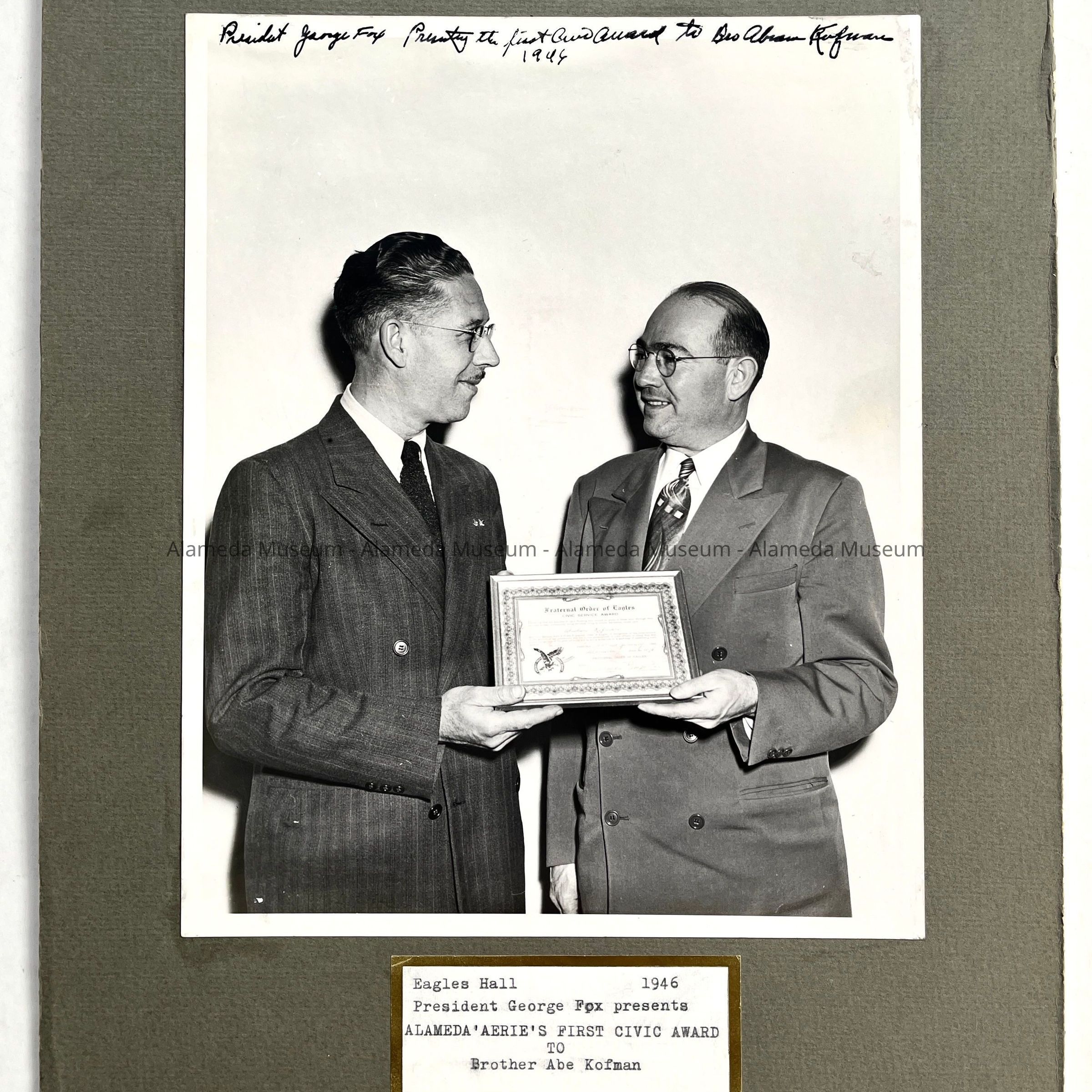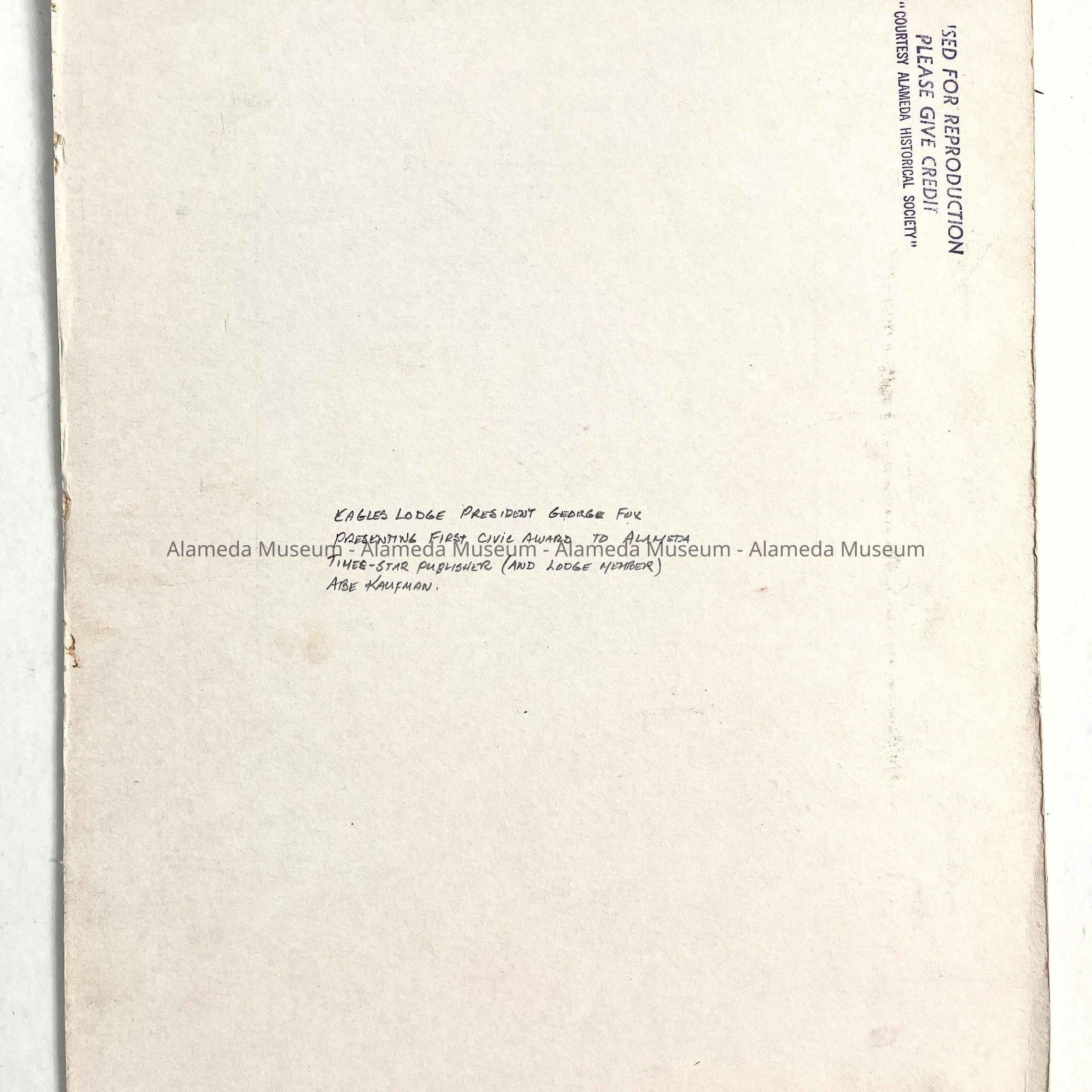 History of Object: Lodge President George Fox presenting Alameda Aerie's first civic award to Brother Abe Kaufman (Alameda Times-Star Publisher).