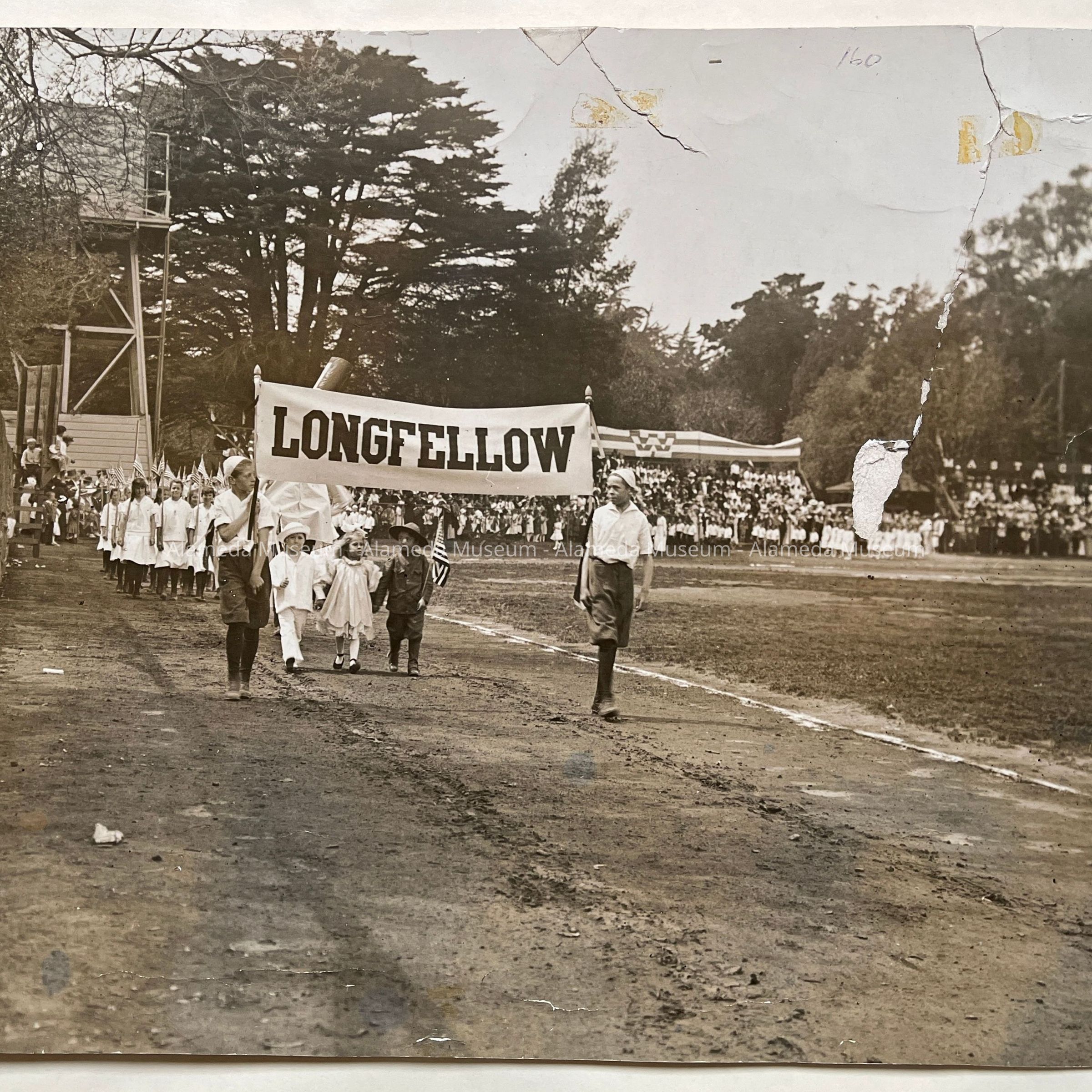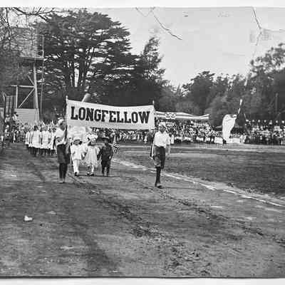 History of Object: Longfellow School students marching in a parade participated in by the various Alameda elementary schools. This festivity was supervised by Otto Rittler.