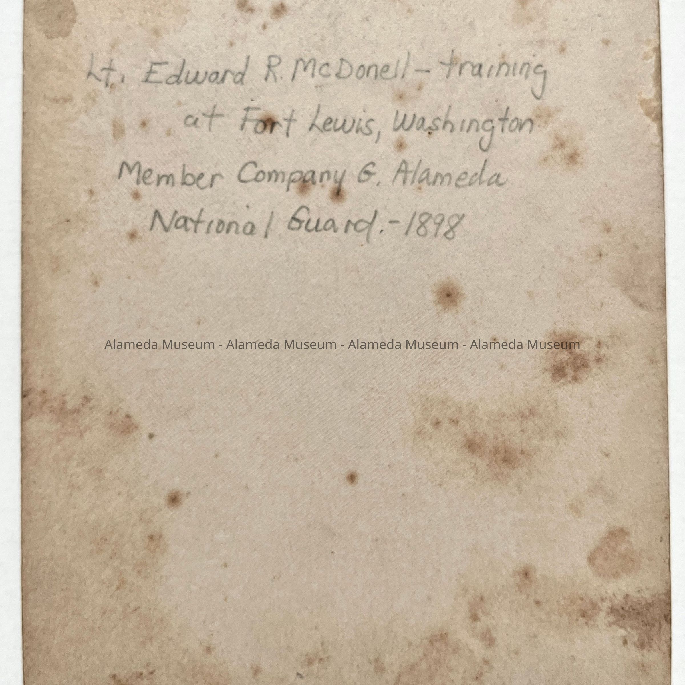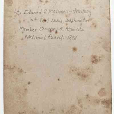 History of Object: Photo of Lt. Edward R. McDonell training at Fort Washington prior to serving in the Spanish American War. He was a member of Company G., Alameda National Guard.