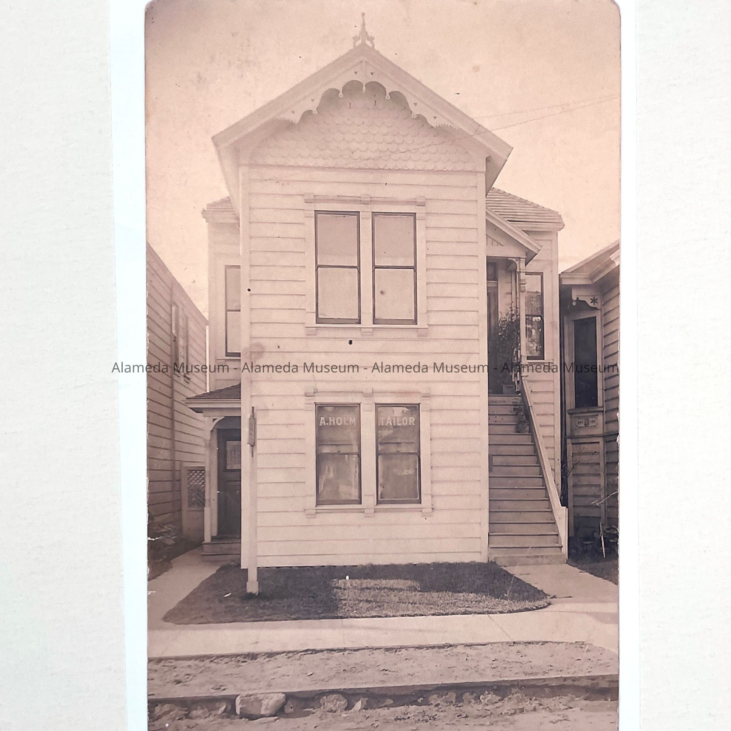 HISTORY OF OBJECT: A PHOTOGRAPH DEPICTING THE MAIN FACADE OF 1191 NINTH STREET, ALAMEDA, WHEN IT WAS THE BUSINESS ADDRESS OF A. HOLM. TAILOR. THE HOUSE STILL STANDS; IT WAS BUILT IN 1889.