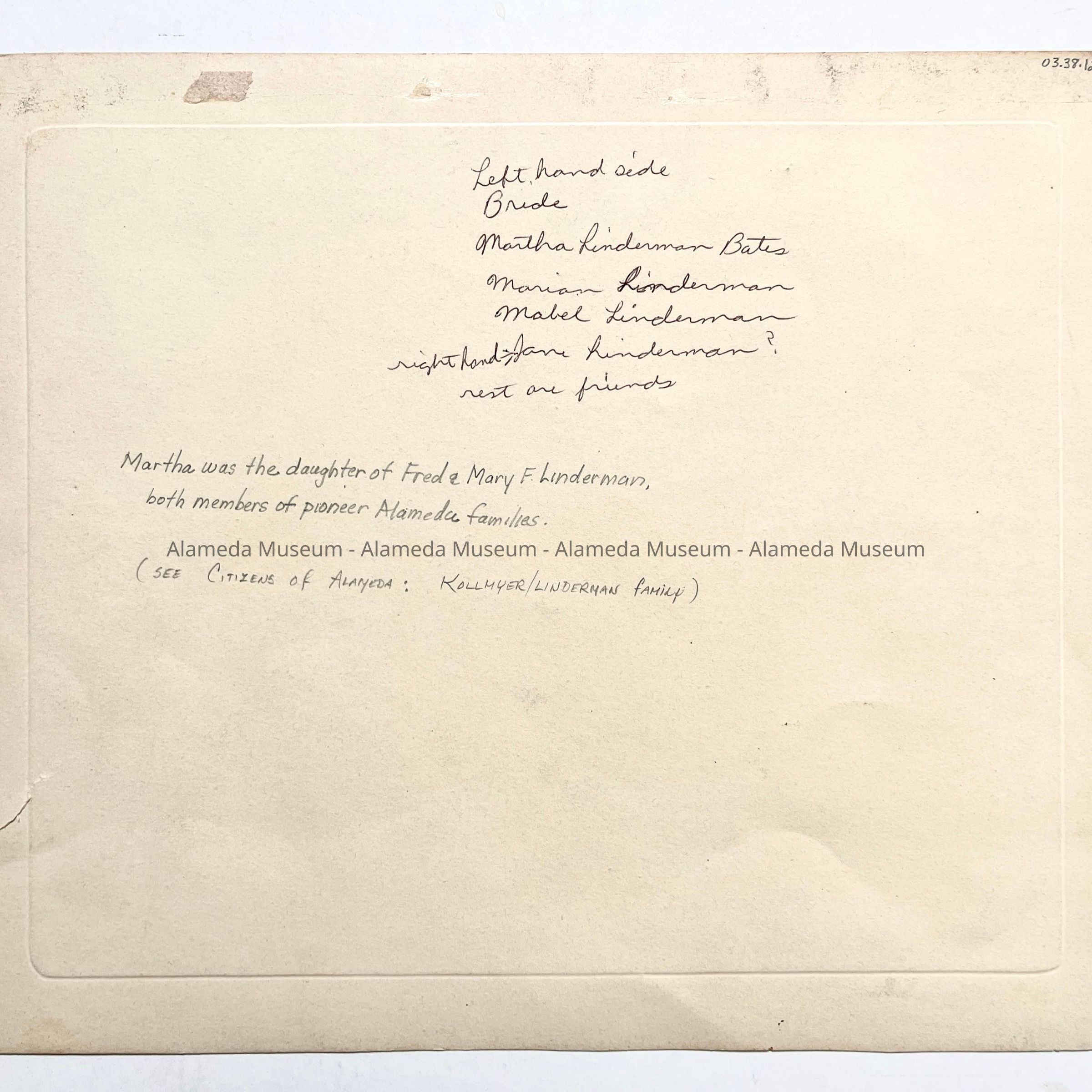 HISTORY OF OBJECT: PHOTOGRAPH OF THE BRIDE, MARTHA LINDERMAN BATES, SURROUNDED BY HER BRIDESMAIDS, INCLUDING HER SISTER, MARION (SECOND FROM LEFT), AND MABEL (SECOND FROM RIGHT). MARTHA MARRIED INTO THE BATES FAMILY WHO RESIDED IN THE 700 BLOCK OF PARU STREET IN ALAMEDA. THE BATES' WERE ALSO A PROMINENT FAMILY IN ALAMEDA. THE GROUP IS POSED IN THE LIVING ROOM OF THE LINDERMAN RESIDENCE AT 2001 ALAMEDA AVENUE.