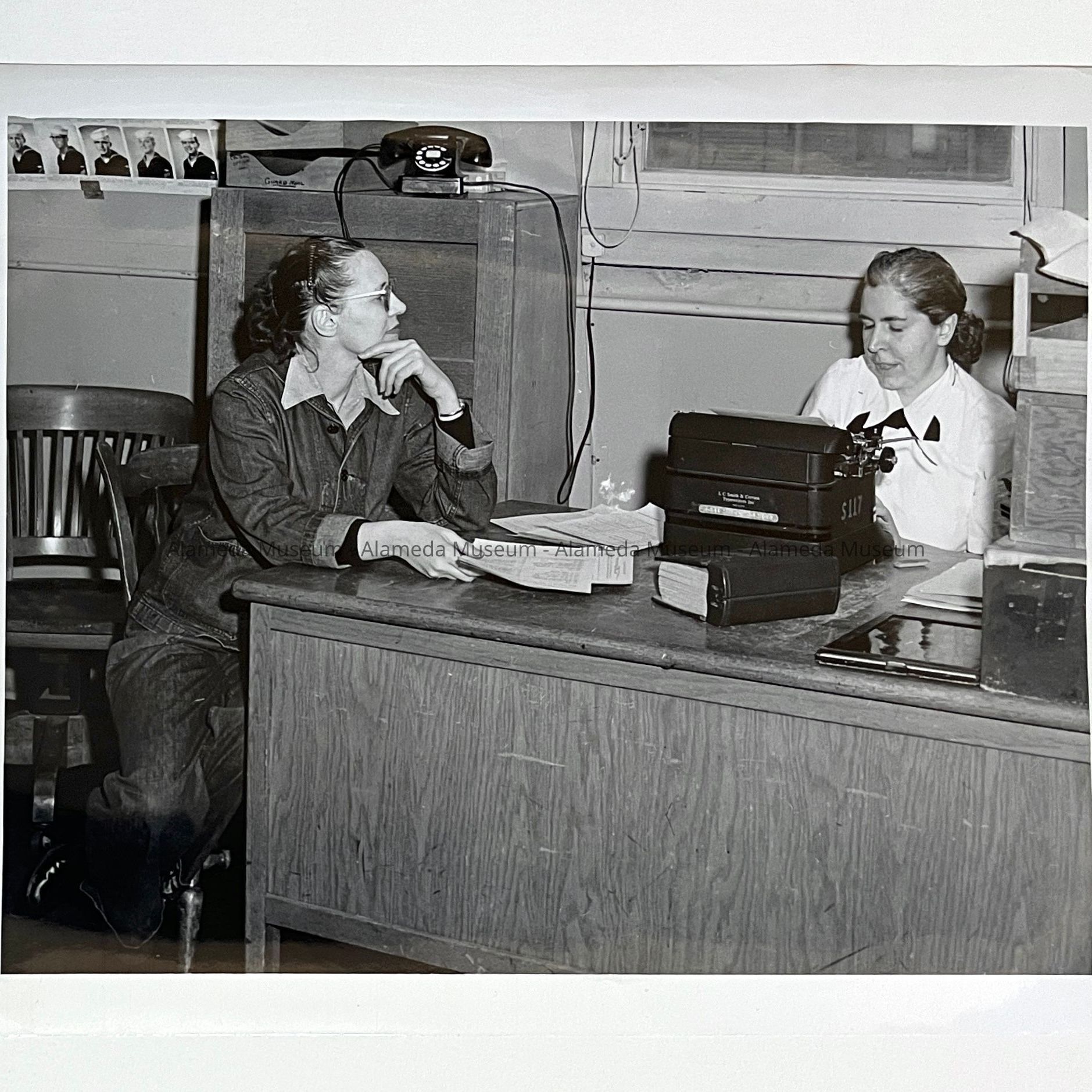 History of Object: Mary Seebach of Oakland, the unit's photographer, is shown seated at her desk talking to another (unidentified) woman.
