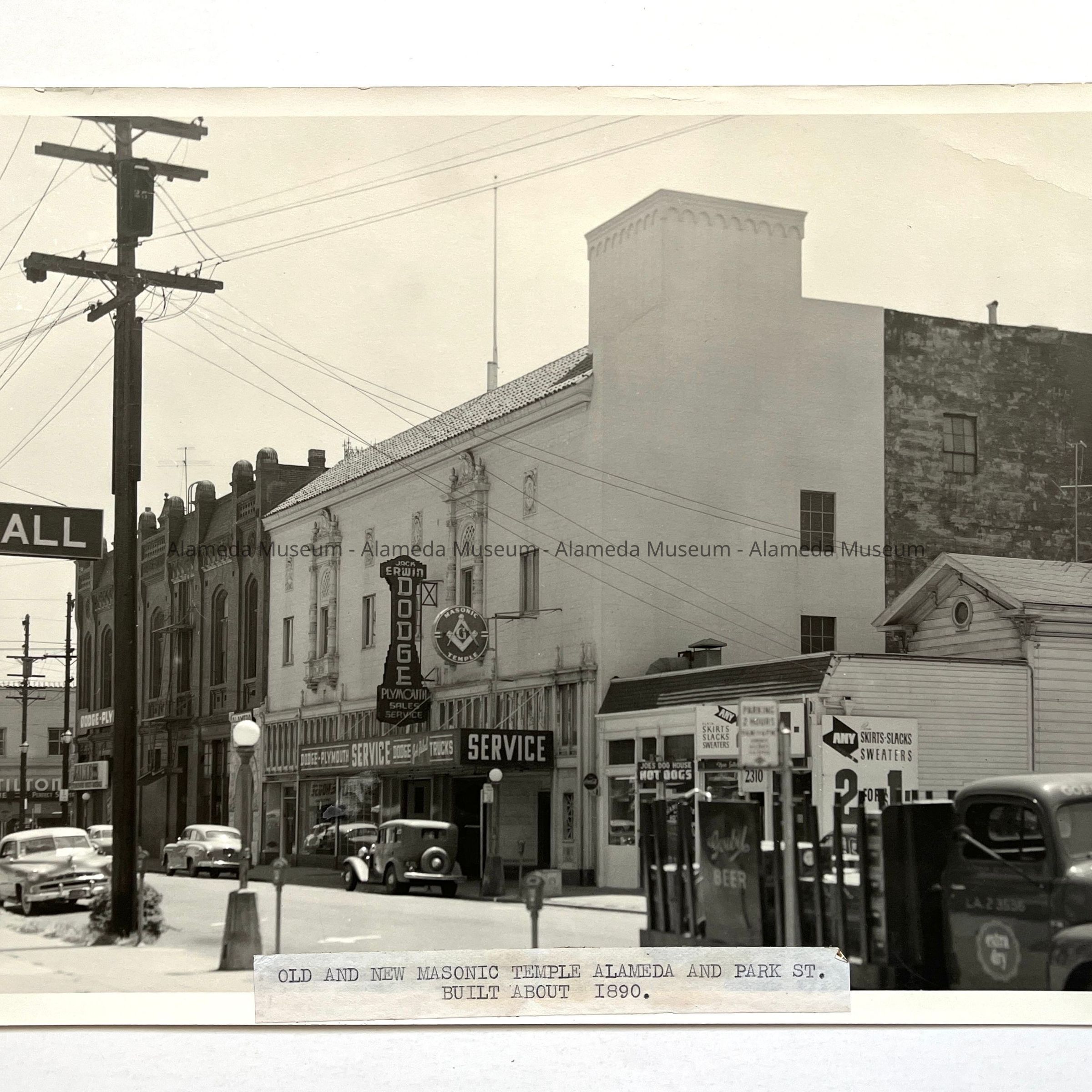History of Object: View of the newer Masonic Temple, showing the Jack Erwin Dodge Plymouth dealership located on the ground floor (the present site of the Alameda Historical Museum). The older Temple is seen in the left background.
