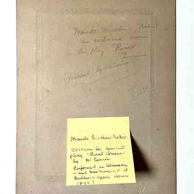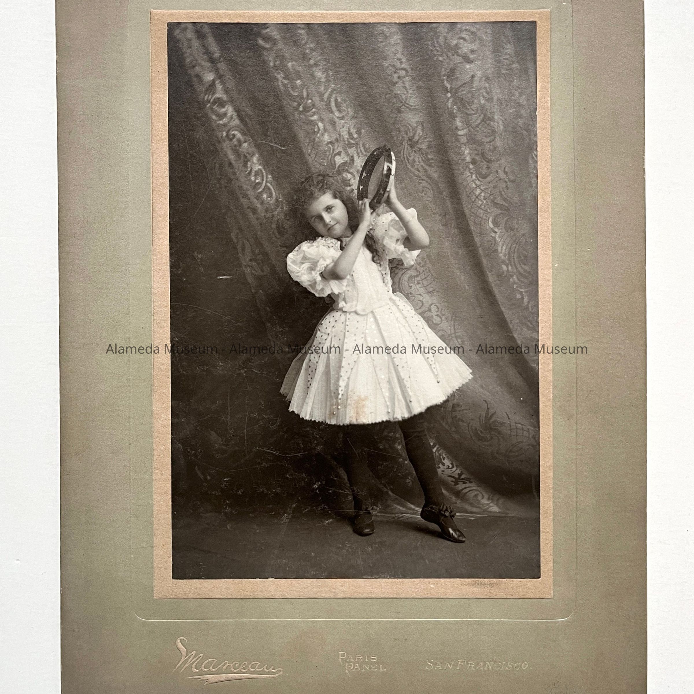 History of Object: Photo of Maude Fischer wearing the costume she wore as a performer in the musical play "Rival Queens" by McCurrie (Alameda resident). Born in Alameda, daughter of M/M Charles Fischer, she was the step granddaughter of Denis Straub, pioneer carpenter-builder, Alameda.