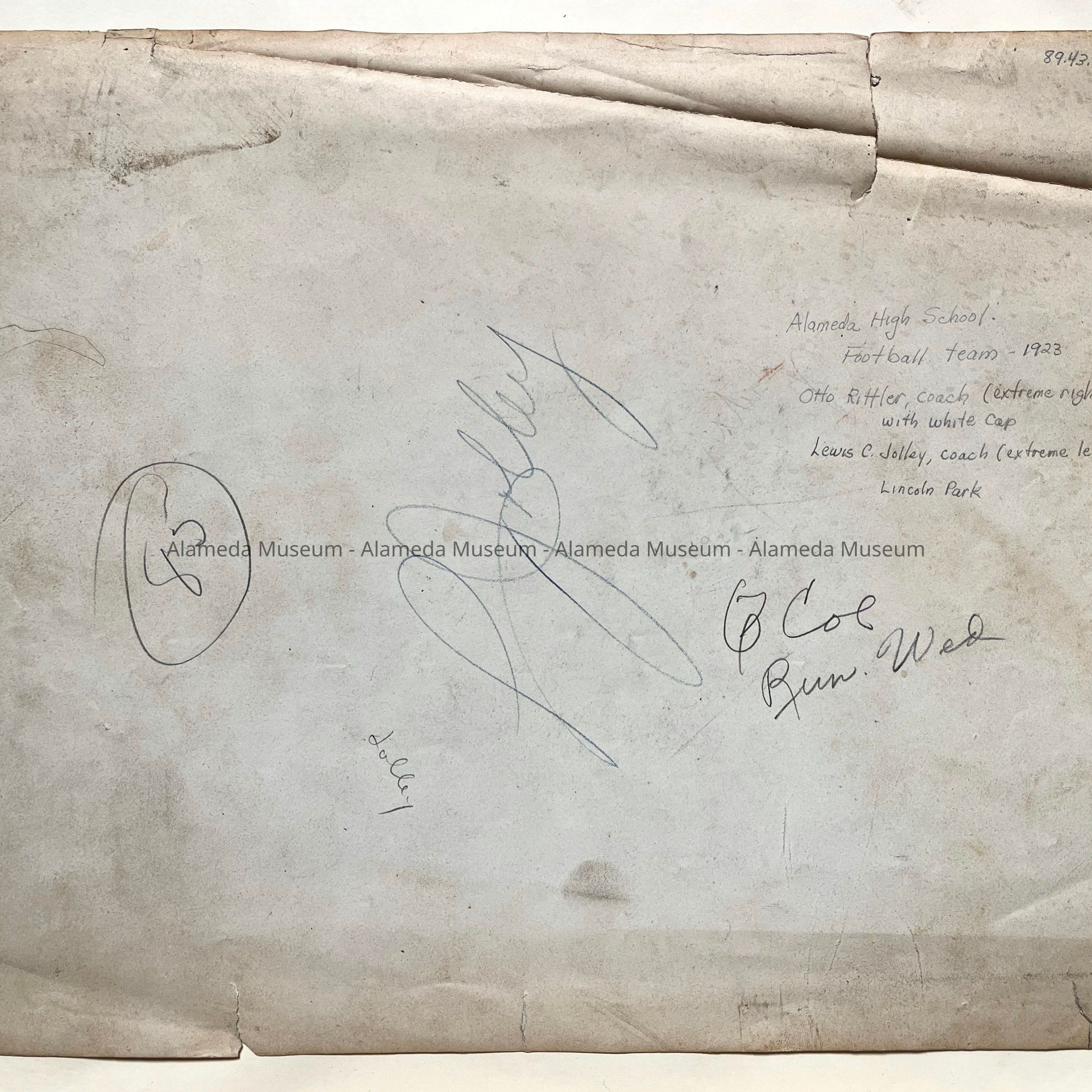 Photograph of the members, plus coaches (Lewis C. Jolley & Otto Rittler) of the Alameda High School football team, Lincoln Park, 1923.