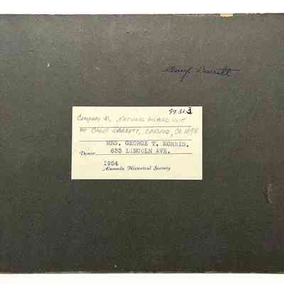 Description: Sepia-toned photo mounted on charcoal paperboard. Photographer unknown. Glue remnants are found along the bottom center section of the image, and an old green cataloging label is affixed to the upper left corner of same, and two staple holes are on the image's top edge.