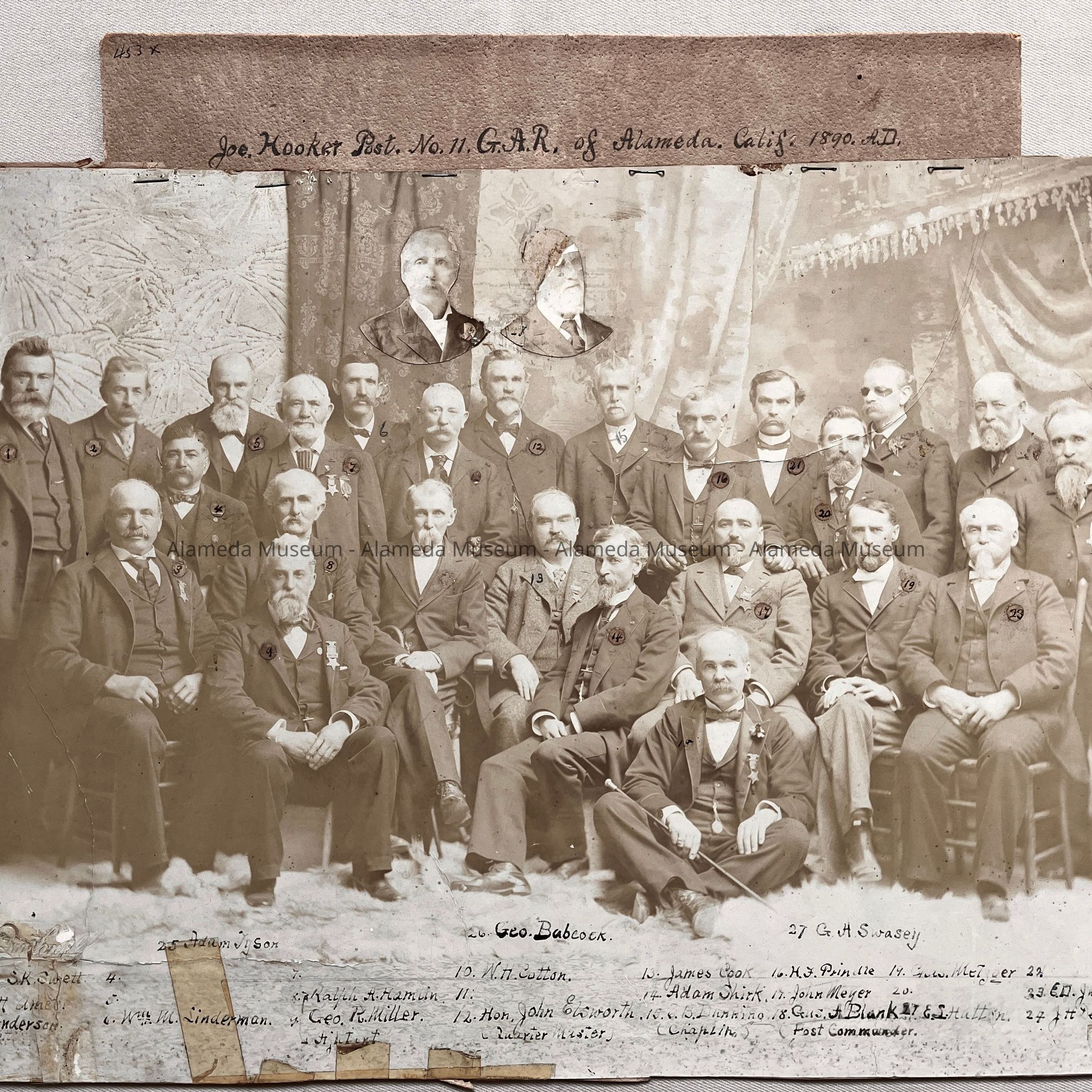 History of Object: Members of Joe Hooker Post No. 11, G.A.R. of Alameda, 1890. Most are identified by name at the lower margin of the image.