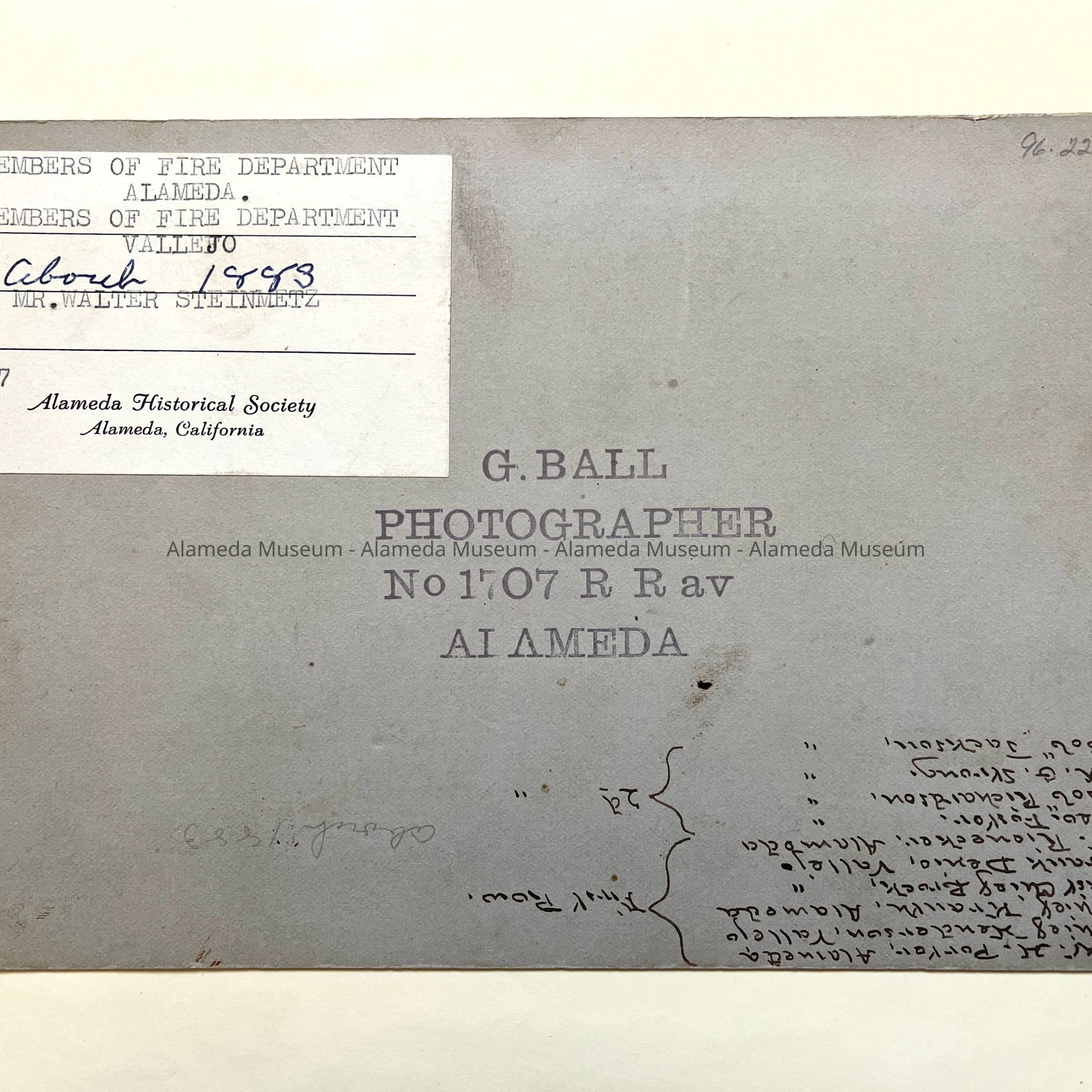 History of Object: Members of the Alameda Fire Department posing with visiting members of the Vallejo Fire Department, ca. 1883. List of names written on verso.