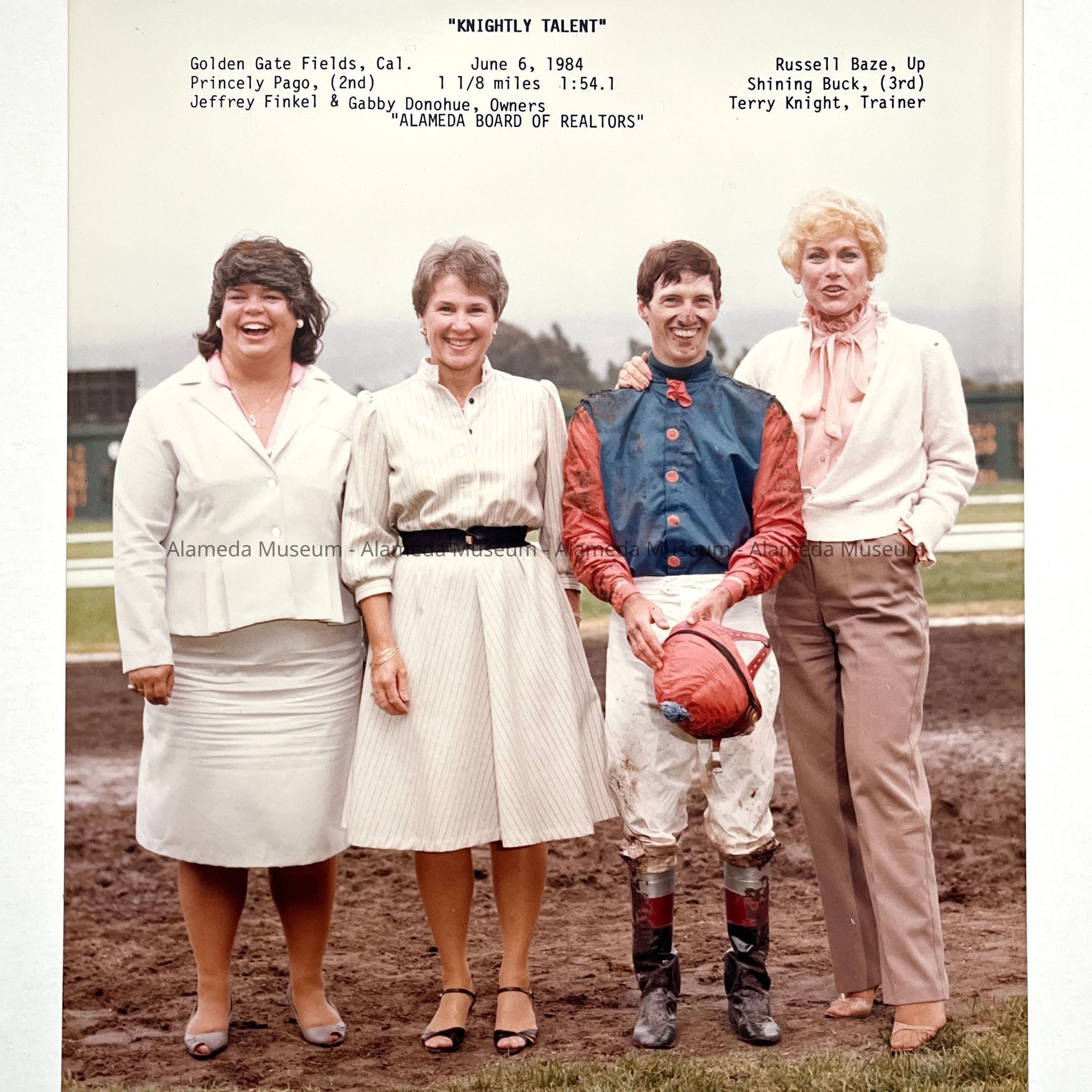 HISTORY OF OBJECT: A PHOTOGRAPH OF MEMBERS OF THE ALAMEDA BOARD OF REALTORS, POSED WITH A JOCKEY AT GOLDEN GATE FIELDS, AND DATED "CALIFORNIA, JUNE 6, 1984." DEE PRADO IS PICTURED SECOND FROM THE LEFT.