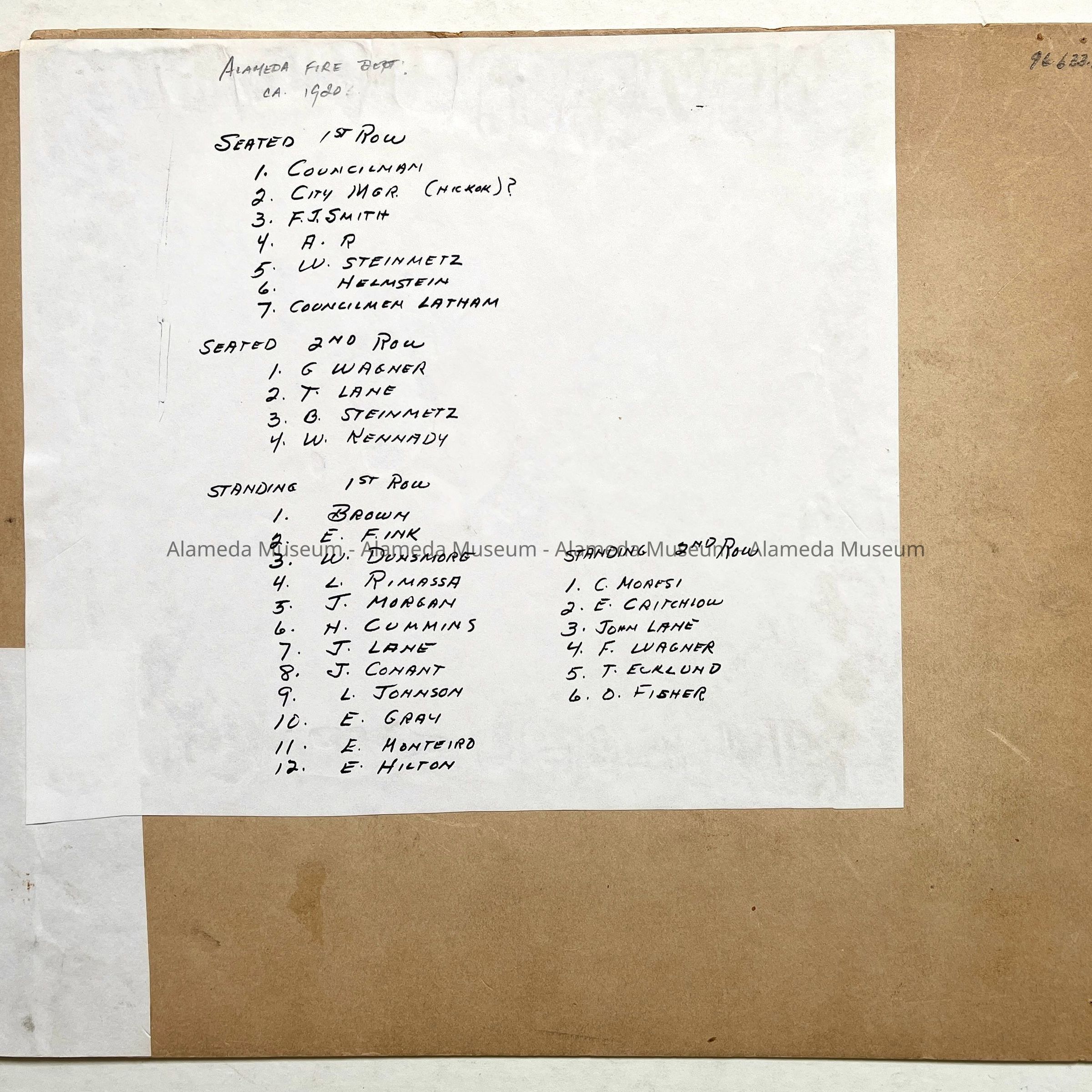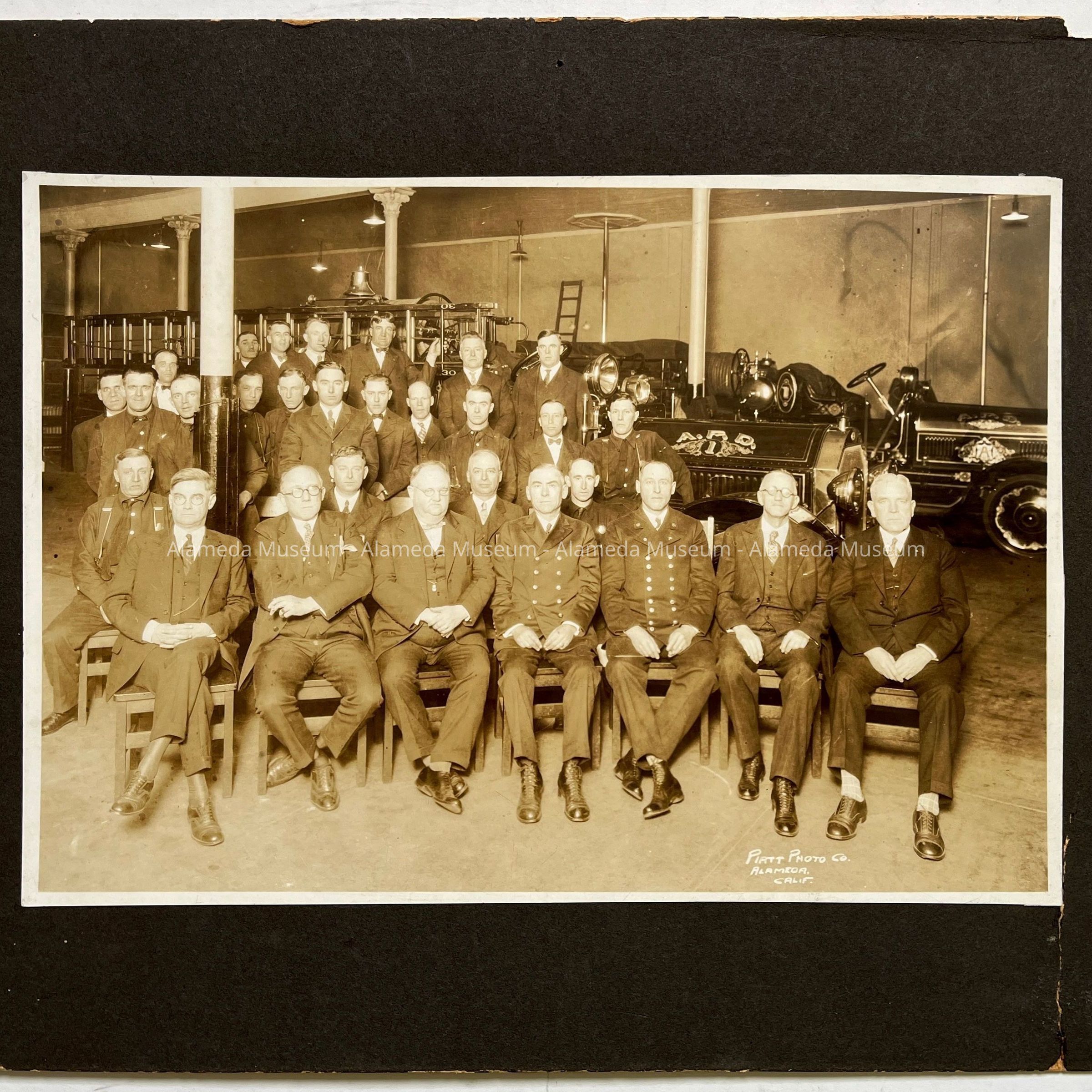 History of Object: Members of the Alameda Fire Dept. in a group photo at the main fire house with visiting city officials, some of whom are identified on verso.