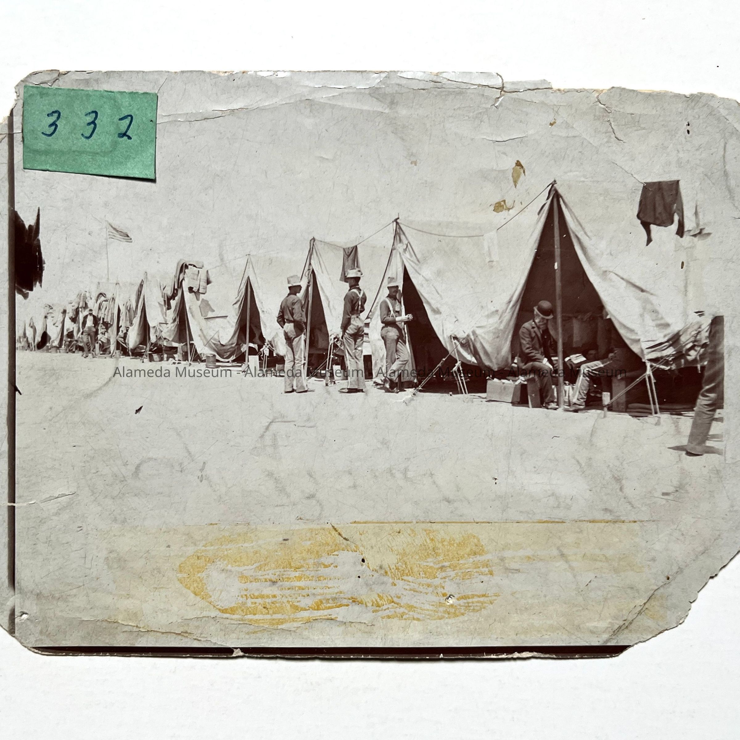 History of Object: A row of tents showing enlisted men, with visitors, of Alameda's Company D, National Guard, at Camp Barrett, Oakland.
